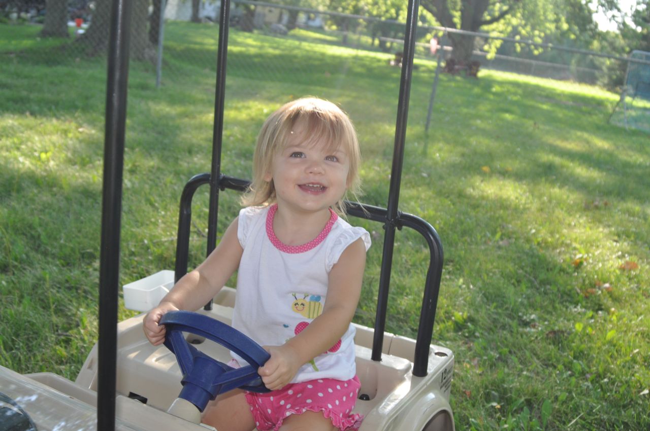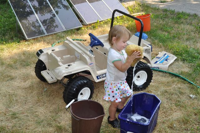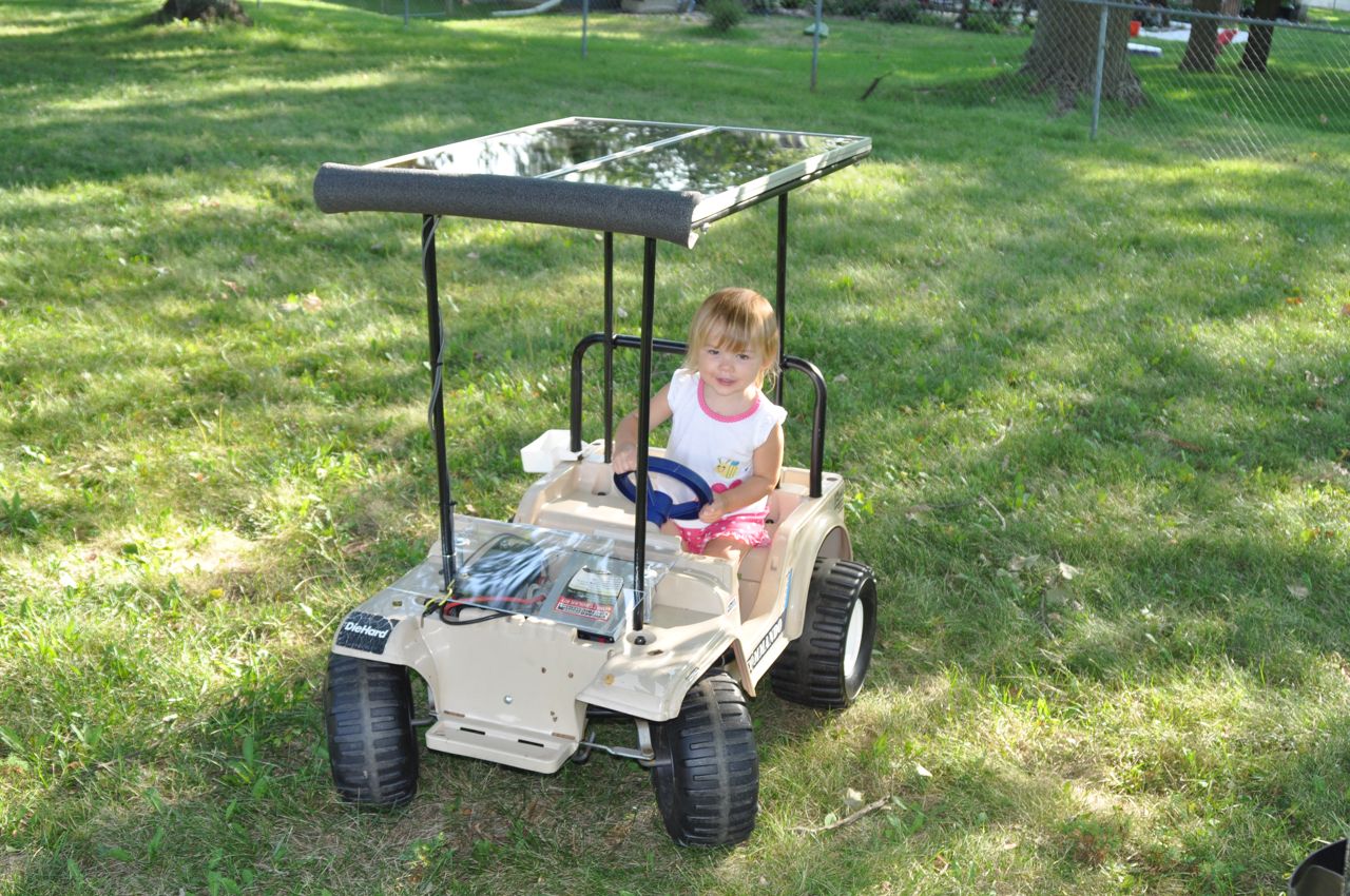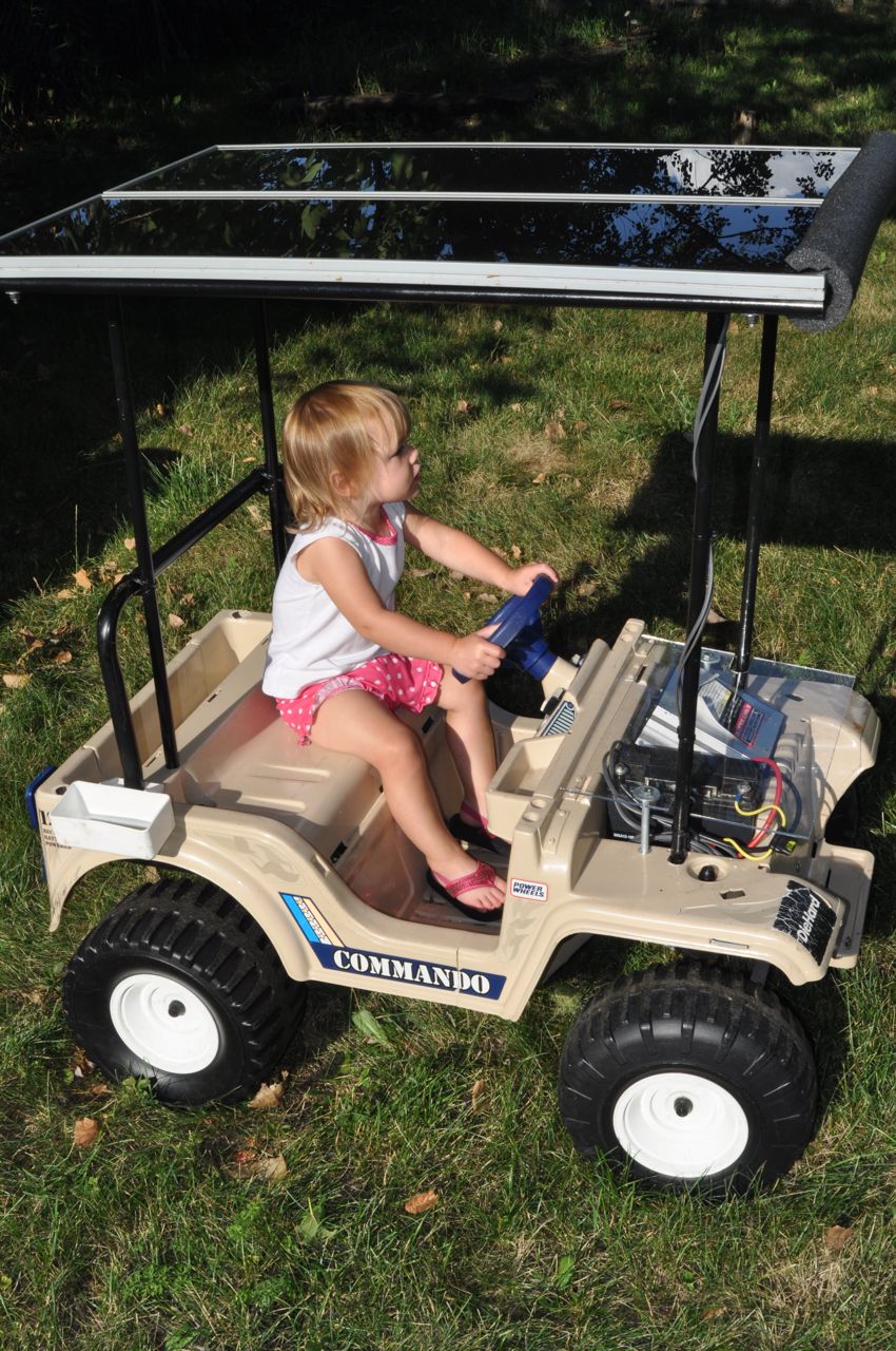 P.S. It’s been a year and the Solar PowerWheels still works great! The worst problem I’ve had is keeping adults out of it when I show it off at energy fairs! Here’s my little girl, one year older, and still having a blast!
