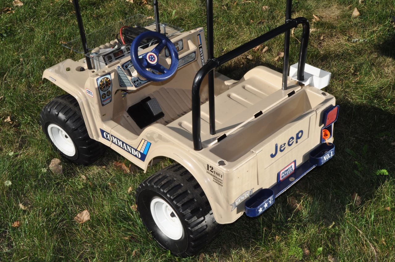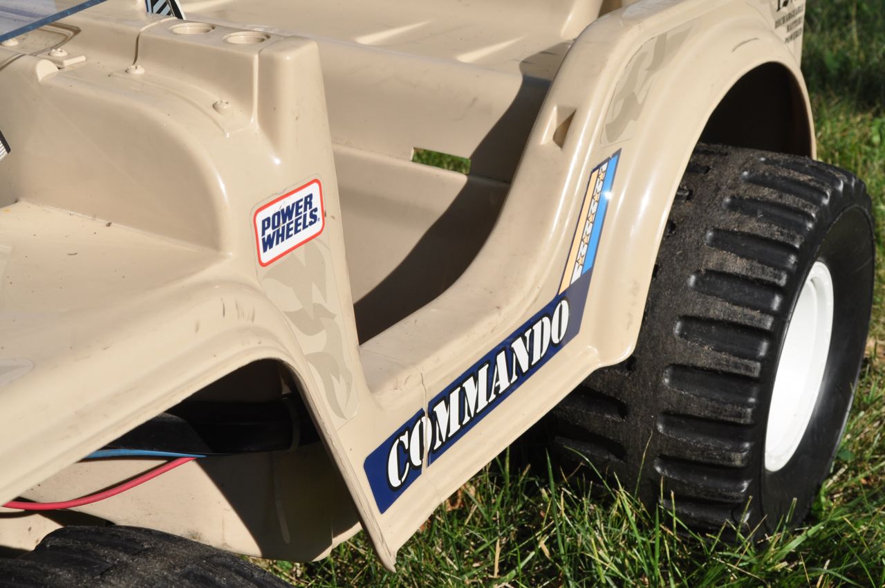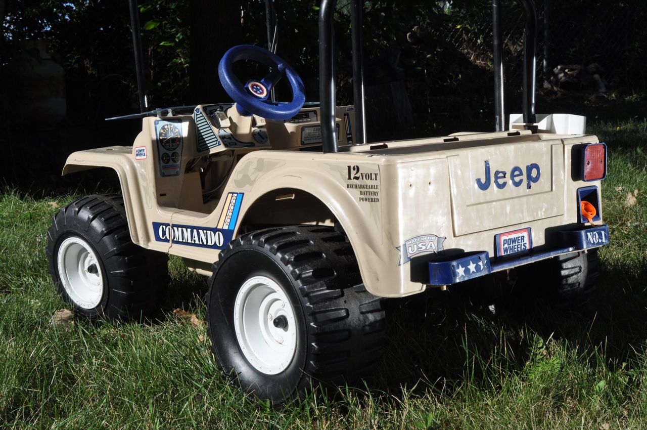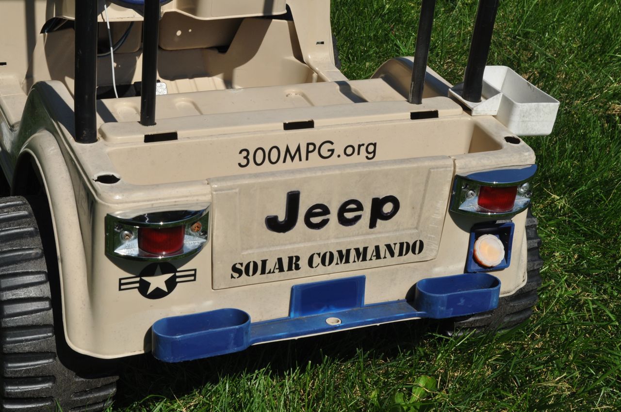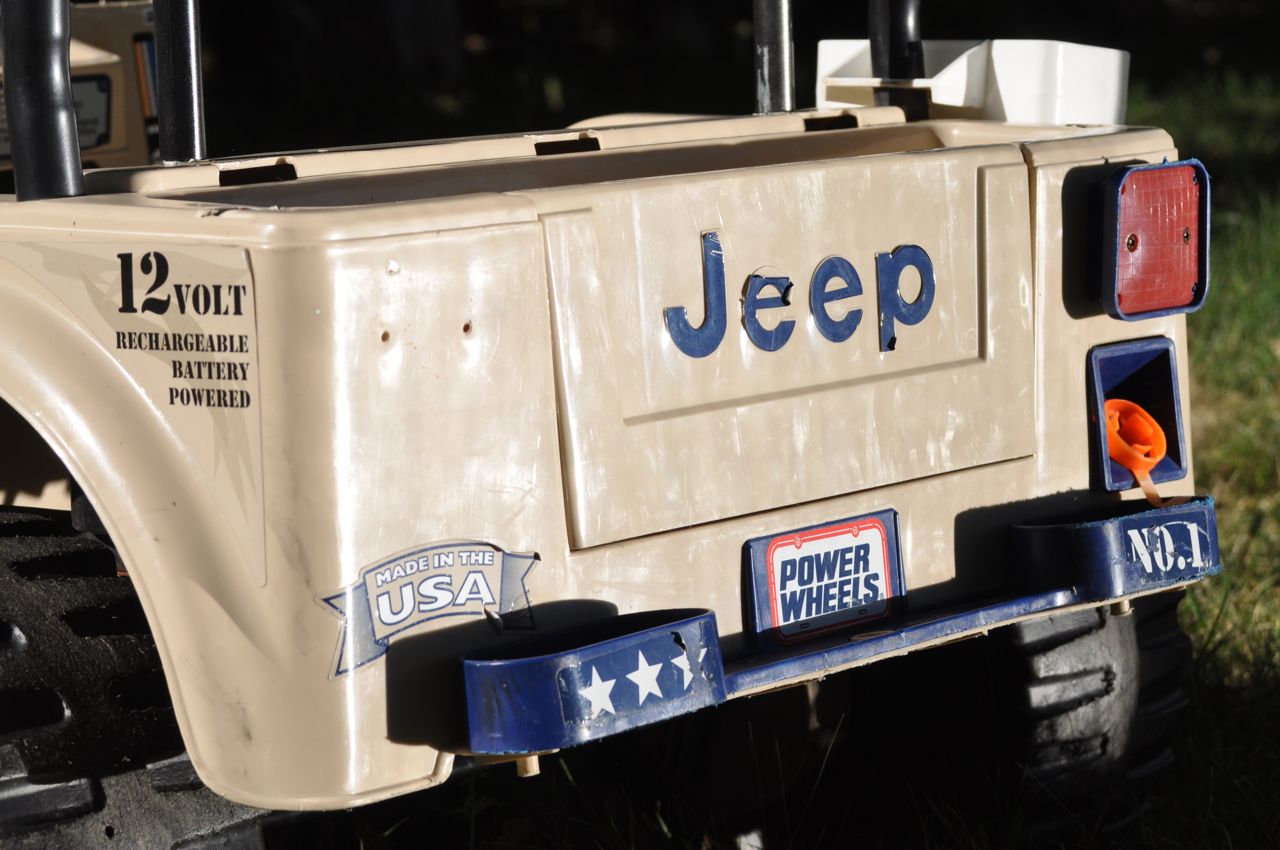PPS: It’s been about two and a half years, and I still haven’t plugged the car into wall power! The old sticker on the Jeep have weathered off, and a neighbor kid crashed the car into a tree in our back-yard, breaking the clear plastic “hood” cover. I made a new cover from 1/4″ instead of 1/8th” plexiglass and created some new stickers using a vinyl-cutter. The Jeep has working tail-lights. I’m still considering adding working headlights.