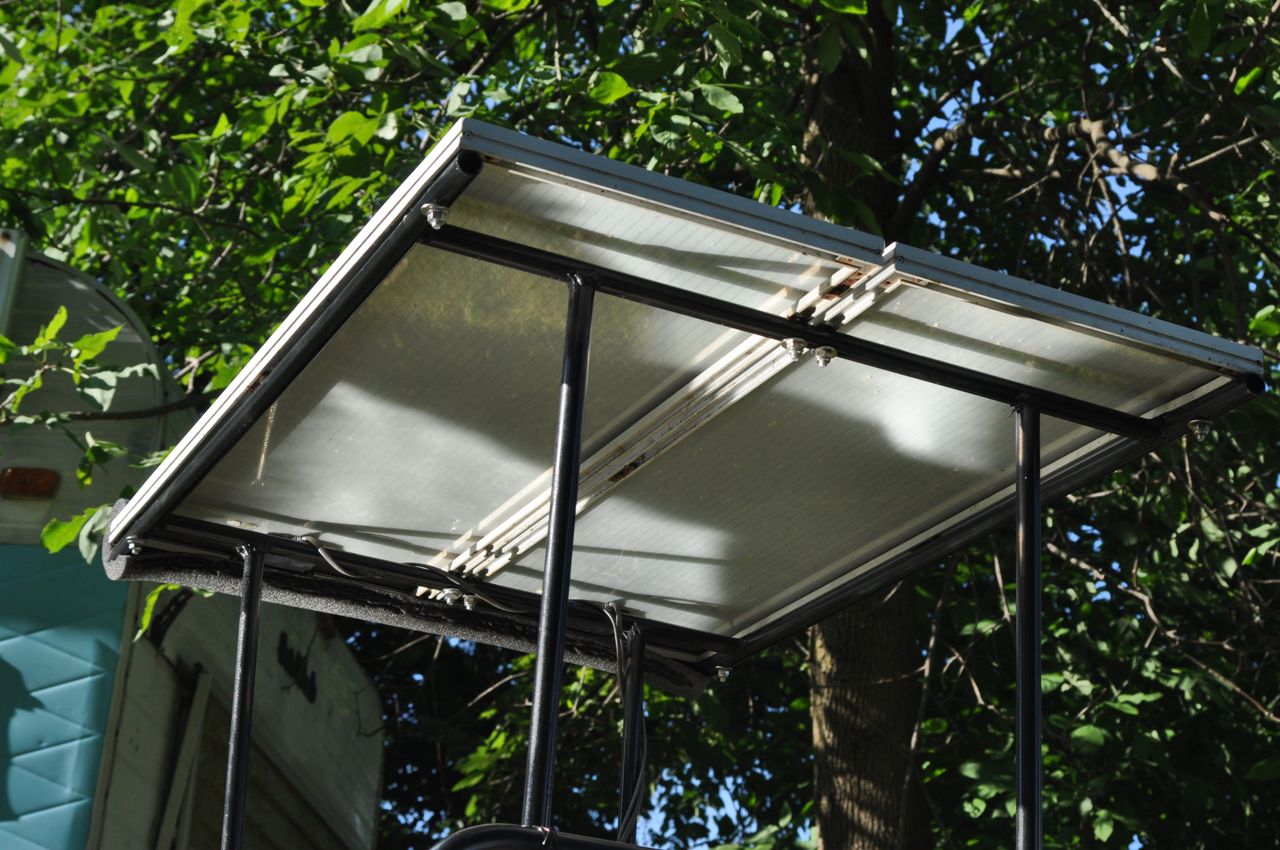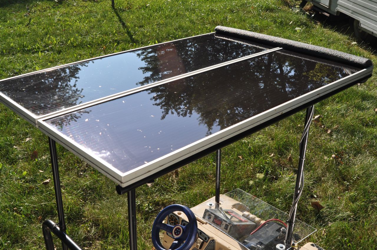 I also had a Harbor Freight 45-watt solar panel kit. It dawned on me that the solar panels are really just a battery charger, and almost the exact right size for charging a used battery I had AND making a great roof for the car.