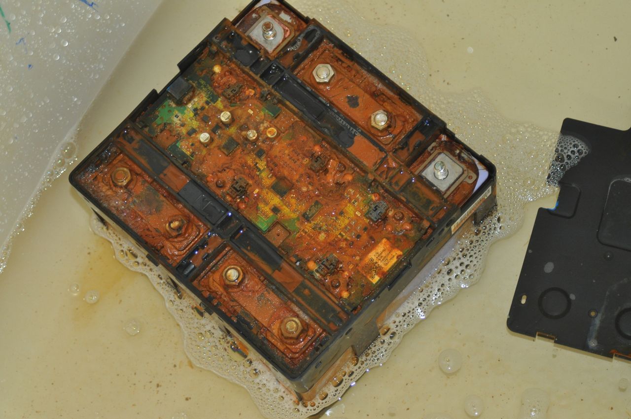 One of the warnings on the battery included to NOT get it wet. Of course, that was a laundry list, which also mentioned not exposing to sunlight or feeding after midnight. The battery was covered with rusty, icky, red sludge, so into the bath it went!