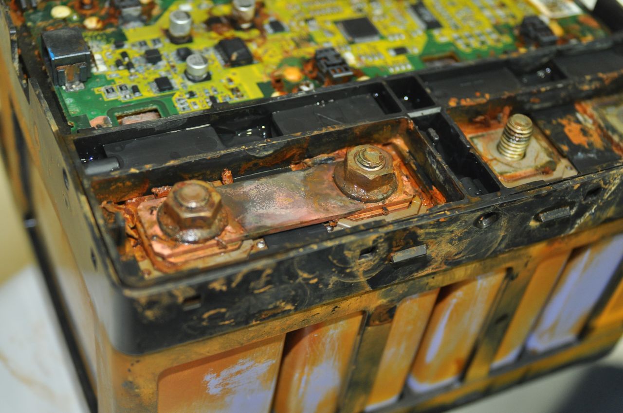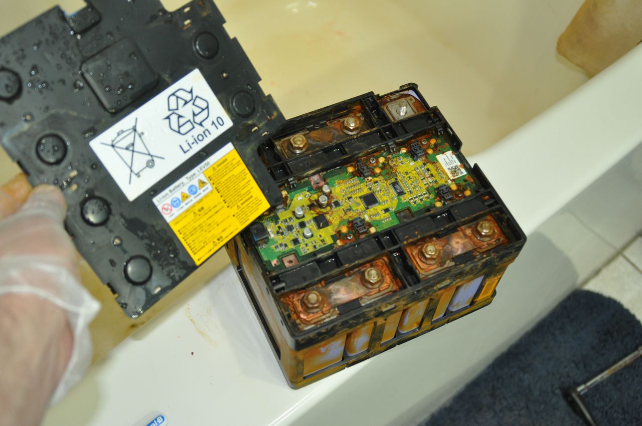 I rinsed the battery off as best I could under the faucet and showerhead (wearing safety glasses and rubber gloves) and then popped off the the top cover. Under that was the BMS board, screwed right down to the cell terminals, and rusted and corroded like no tomorrow. I scrubbed that down with an old tooth-brush and also removed the bus-bars that connected the individual cells.