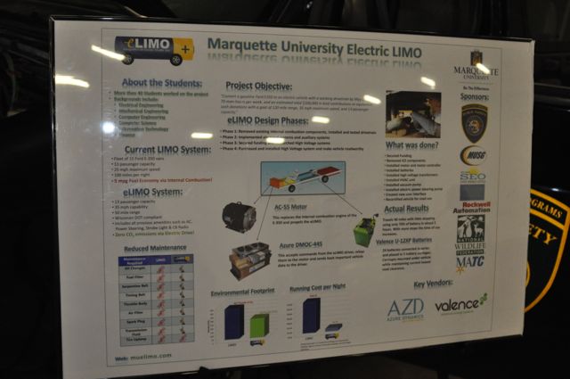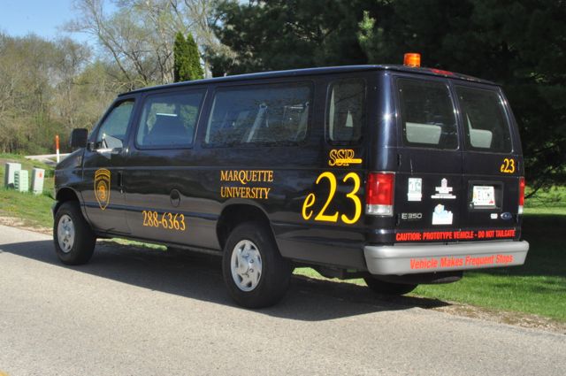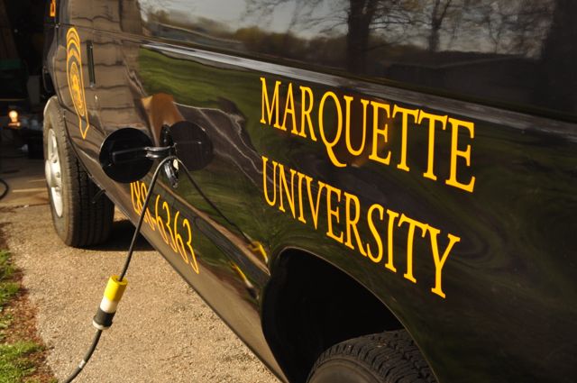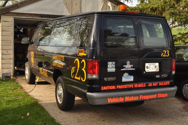 A little while back, Dr. George Corliss of Marquette University (Milwaukee, Wisconsin) called me up, asking if he could charge up the van at my house. The plan was to show off the vehicle at a clean transportation event in Madison, Wisconsin. The van, known as the eLIMO, was designed for use around an urban campus, not for road-trips. So the idea is that the van could make the trip as long as there was somewhere to charge on the way.