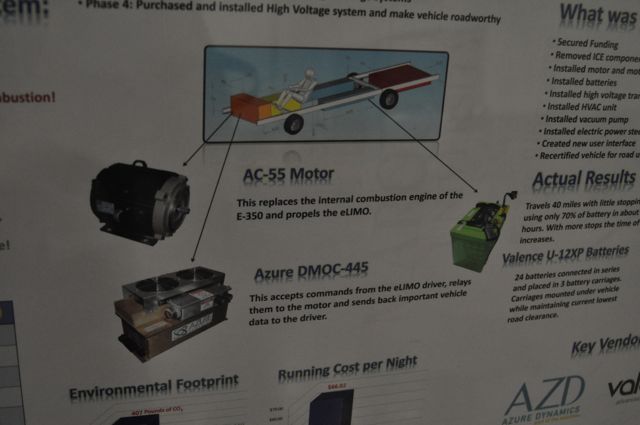 By the time I woke up, the van was already gone, and I headed off to the Wisconsin Clean Cities event. When I got there, I was glad to see the eLIMO set up among other electric, propane, CNG, hybrid, and alt-fueled vehicles. He made it there with 30% charge remaining, and was now plugged into power at the exhibit hall (using that same pig-tail!)