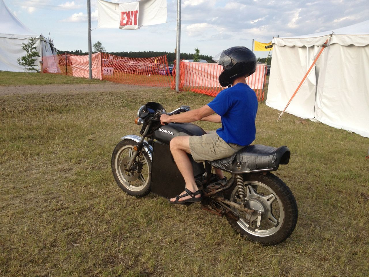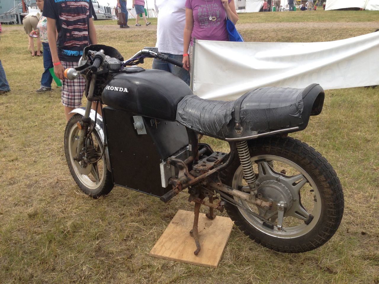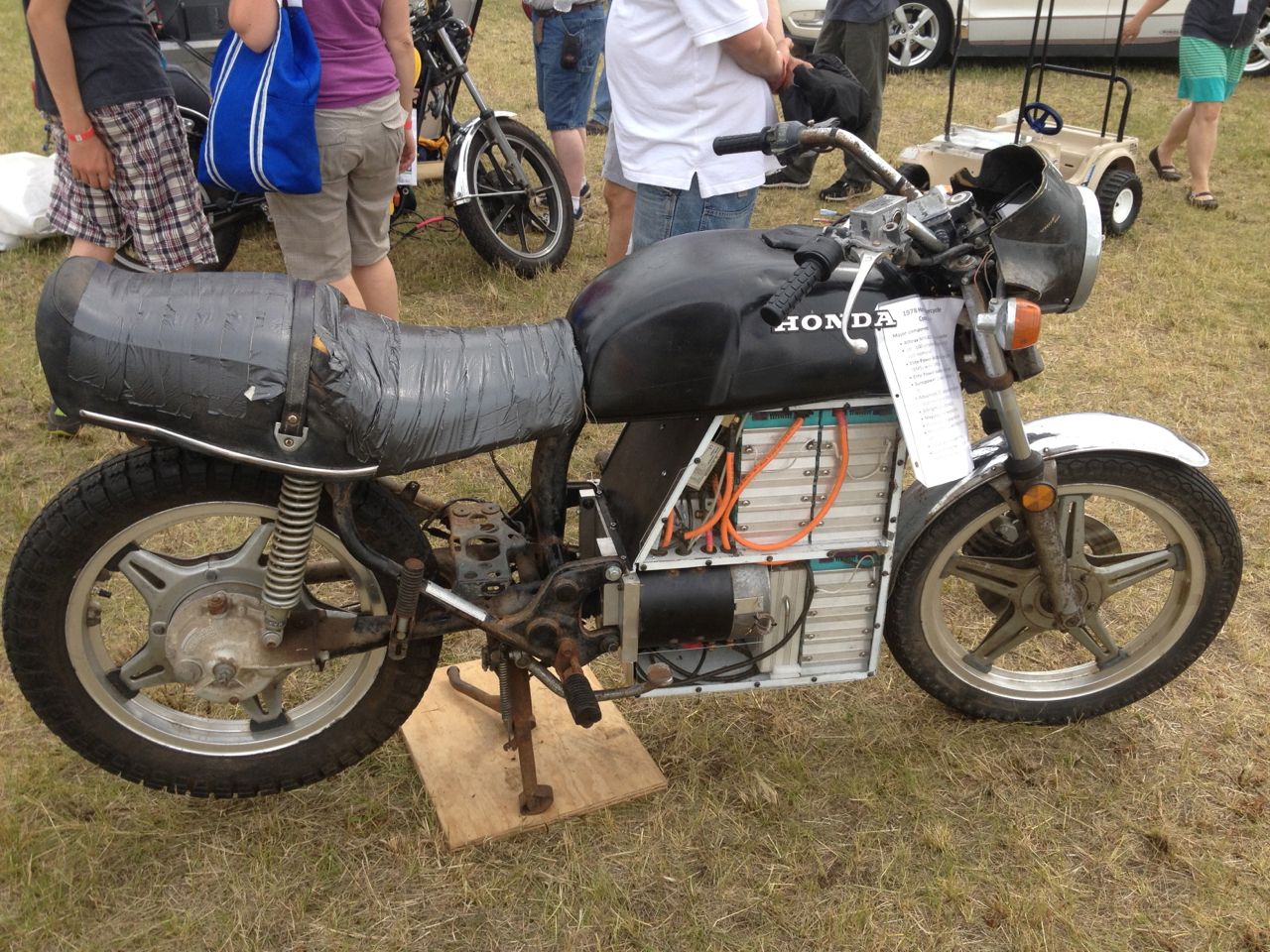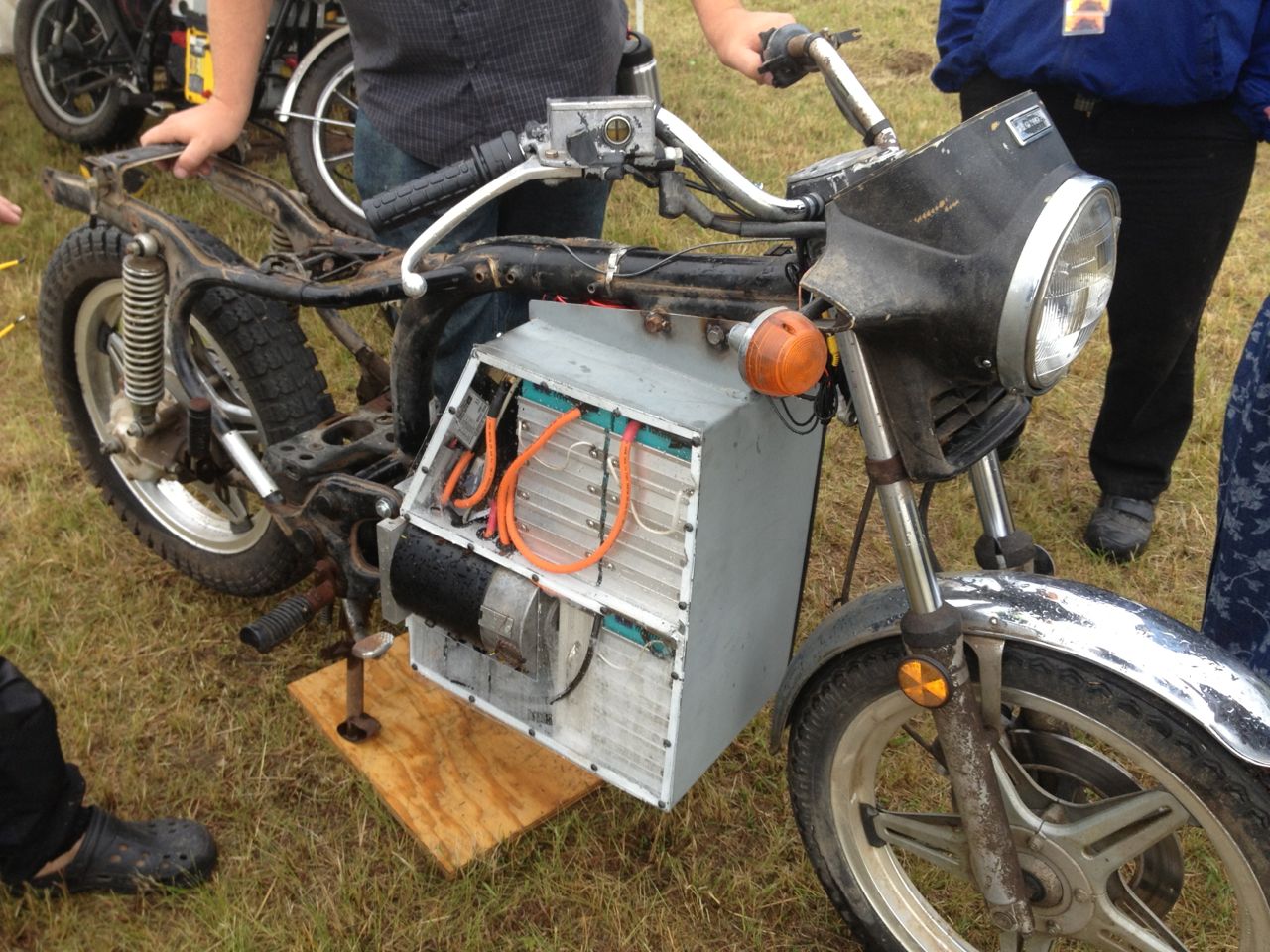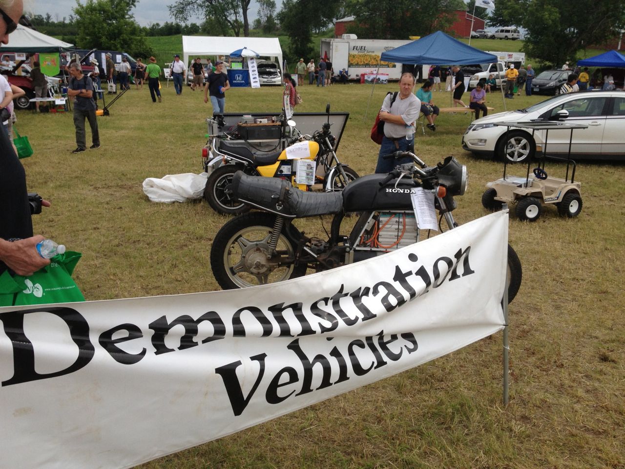 At the end of Friday, with the Fair officially closed, Ryland and I had a chance to quickly test out each others electric motorcycles. We each hopped on our own and shot down the main road just outside the fair. Once at the end of it, we swapped rides and headed back. It’s always fun to try out new electric motorcycles, whether they are DIY or commercially built! Ryland’s cycle is geared higher than mine, so the acceleration isn’t as quick, but it builds to a higher top speed. The electric motor goes straight to a drive-shaft, so there’s NO CHAIN NOISE! His bike is crazy quiet!