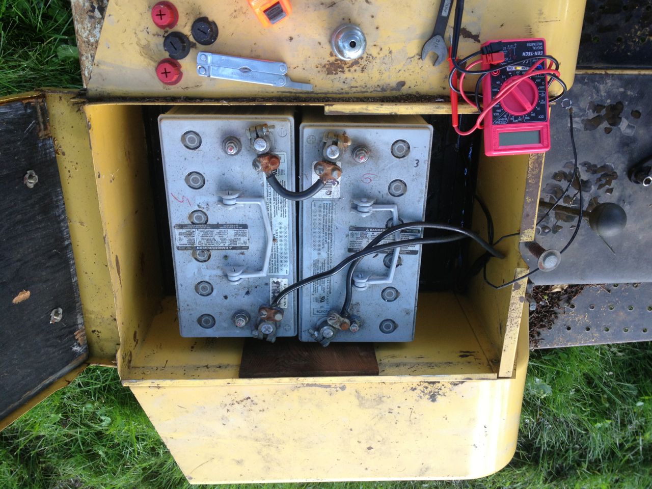 This evening, I unloaded the tractor and got to tinkering with it. I looked through what I had for batteries, and found three matching gel-cells. The tractor would originally have six 6V batteries, but three 12v will do for now.