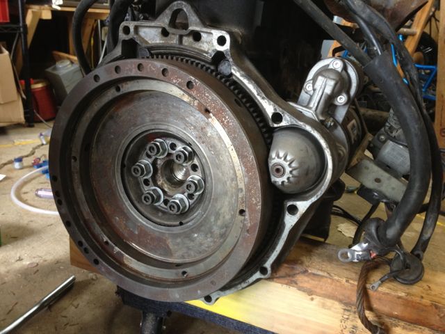 To get started, we needed to reinstall the flywheel and starter. Sounds easy, right? Well, it turns out that both were slightly challenging right off the batt. The length of bolts needed for a manual flywheel instead of the automatic one are different. So, we had to evenly space out the bolts with some thick washers. Not the best approach for the long-run, but we figured it would be fine for just getting the engine to turn over.