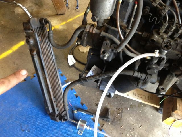 The oil pump had two loose hoses. Something would have to be done with those before starting the engine, otherwise oil would just be shooting everywhere. I dug up the original radiator, which had the oil-cooler connected to the side of it. We took off the oil cooler and plumbed it to the engine. Looking at the cooling system, we saw that the water pump was shot. We pulled it off. Sure enough the bearings on the impeller were seized up. Time to order a new one!