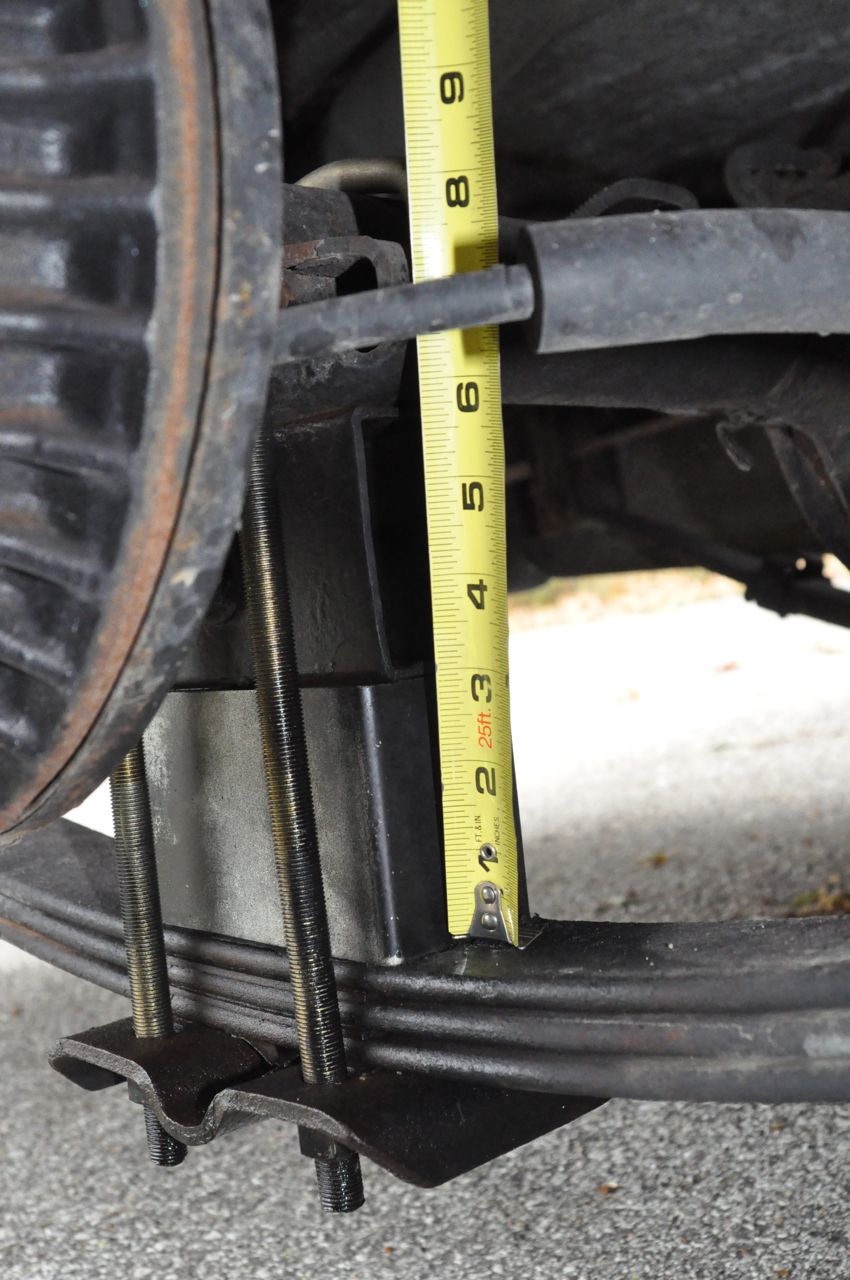So, that was four to five hours that morning and about six the day before, and I still had to fix the BACK suspension! At this point, the front of the truck looked great, but the rear was now six inches LOWER than the front. Not exactly the best setup for good safe driving! Fortunately, un-lowering the back of a pickup truck is pretty straight-forward. Good thing too, as I was now left by myself to figure it out. To lower a truck, spacing blocks are placed between the rear axle and the springs, which go under it. The axle stays at the same height (however high the tires put it against the road) but the body is brought down.
