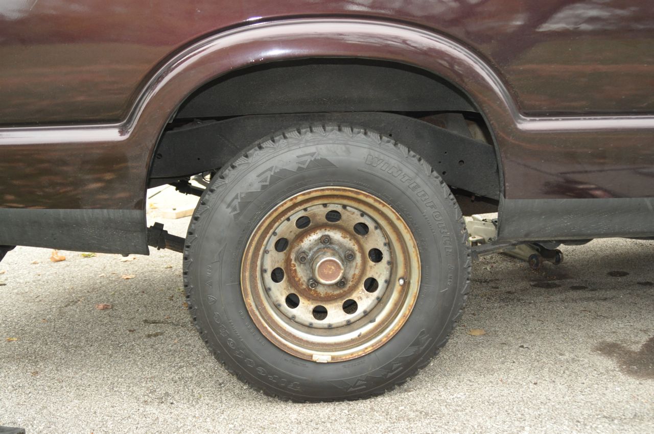 With the truck still up in the air, I put snow-tires on the back. Winter is coming. (Make your Game of Thrones comment at the bottom…) Besides better traction, putting on the snow tires also let me put the old summer tires on the front, replacing the tire damaged when the truck wump-wump-wumped its way around the left-hand-turn with no ball joint. The other rear tire is now my spare.