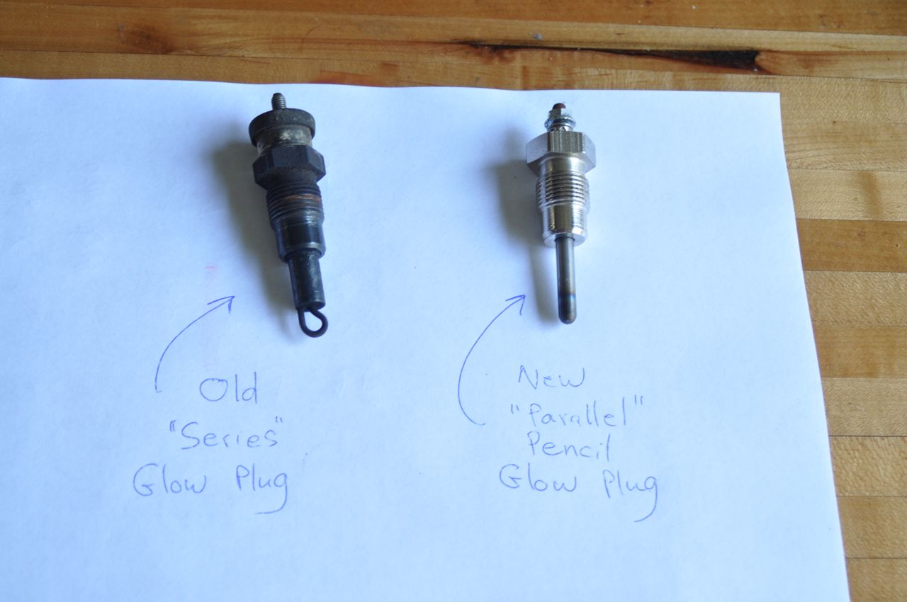Comparing the old glow plugs to the new, one physical difference is pretty obvious. The old plugs have a loop on the tip. This is so that the current can travel through the plug and on to the next one. They are all connected in series. The big downside is that if one glow-plug fails, it breaks the circuit and they ALL stop working.