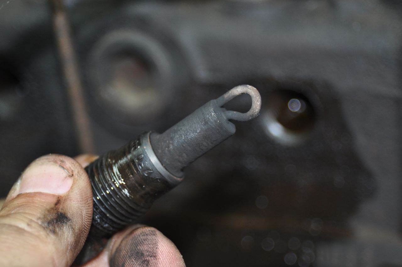 Next, I could remove the glow-plugs themselves. However, I didn’t have the right size wrench. The biggest I had was 19 mm, and the glow plugs seemed to be just a hair larger than that. I used an adjustable wrench to get them started and then used an oversized socket to unthread the glow-plugs the rest of the way.