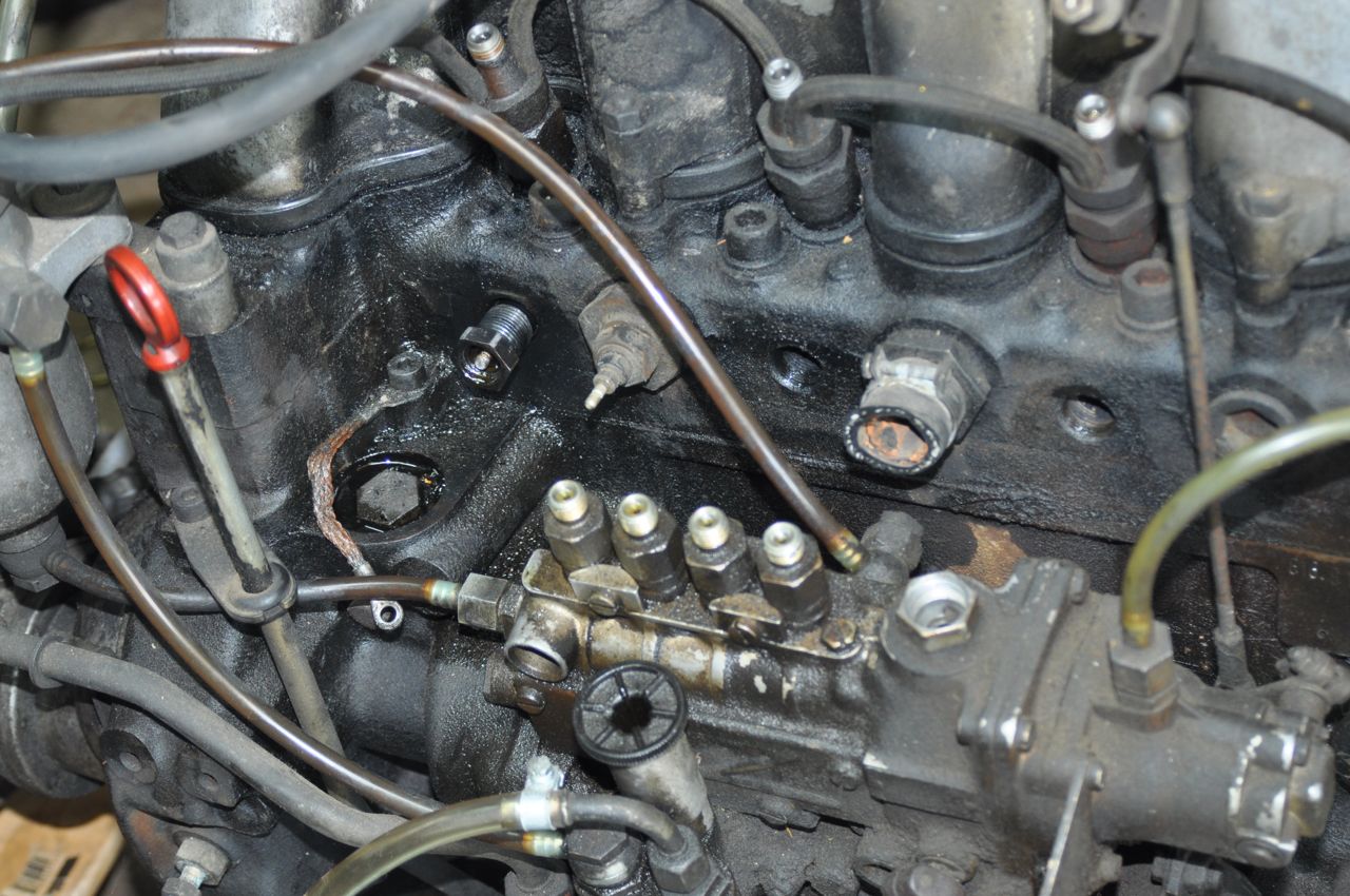 To start with, the glow plugs are actually rather difficult to get at with the hard fuel lines between the injection pump and the cylinders getting in the way. The first step was to remove those. I cracked open the connections with a 17mm wrench on both ends of the lines and loosened them the rest of the way by hand. The metal tubes easily pulled away. (I put them in gallon plastic zipper bags and labeled them.)