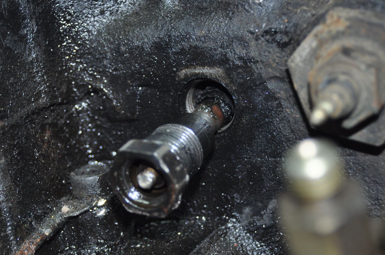 I had trouble with the plug furthest to the left (closest to the radiator if the engine was still in the car.) Although I completely unthreaded this glow-plug, it still would NOT pull out! I finally figured out that I was spinning only the OUTSIDE portion of the plug, but that the narrow inner part wasn’t spinning at all. It was seized up, stuck in place. I’ve heard of glow-plugs getting gunked-up with carbon, and it looked like this one must have been stuck in it. After breaking the tip off the glow plug with a vise-grips, I started fooling around with several small pry bars. Since the threads were all the way out of the engine block, I figured it was just carbon holding the plug in, and with some prying, I was eventually able to get it out.
