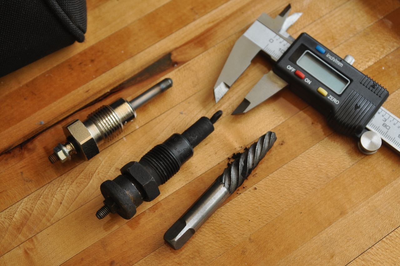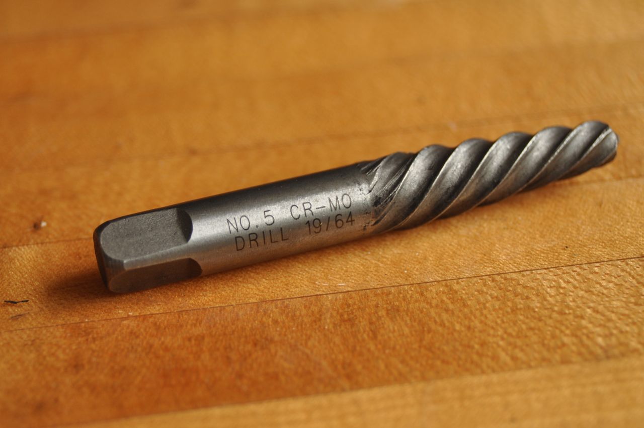 Sure enough, I took some measurements of an old glow plug, a new glow plug, and the two larger screw extractors of the five in the set. It looked the the largest (#5) was just a hair bigger diameter than the old style glow-plug – just perfect for reaming out the hole.