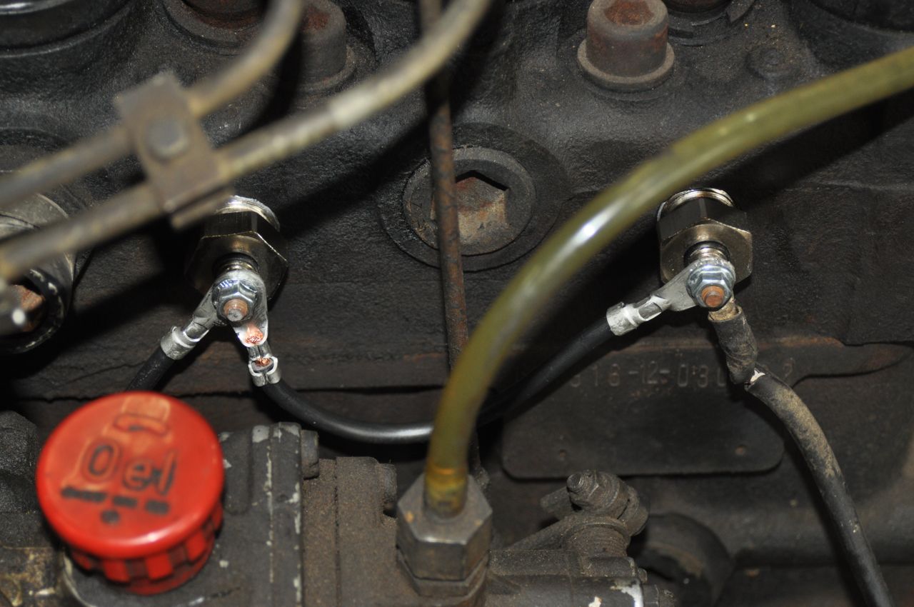After running all four of the spark-plugs in, I set to wiring them up. This was pretty darn easy. All I did was put a short, heavy wire from each spark plug to the next. I found my purple-and-white wire that went to the original glow-plug relay connection, and hooked that up as well, even though it wasn’t going to a switch or battery.