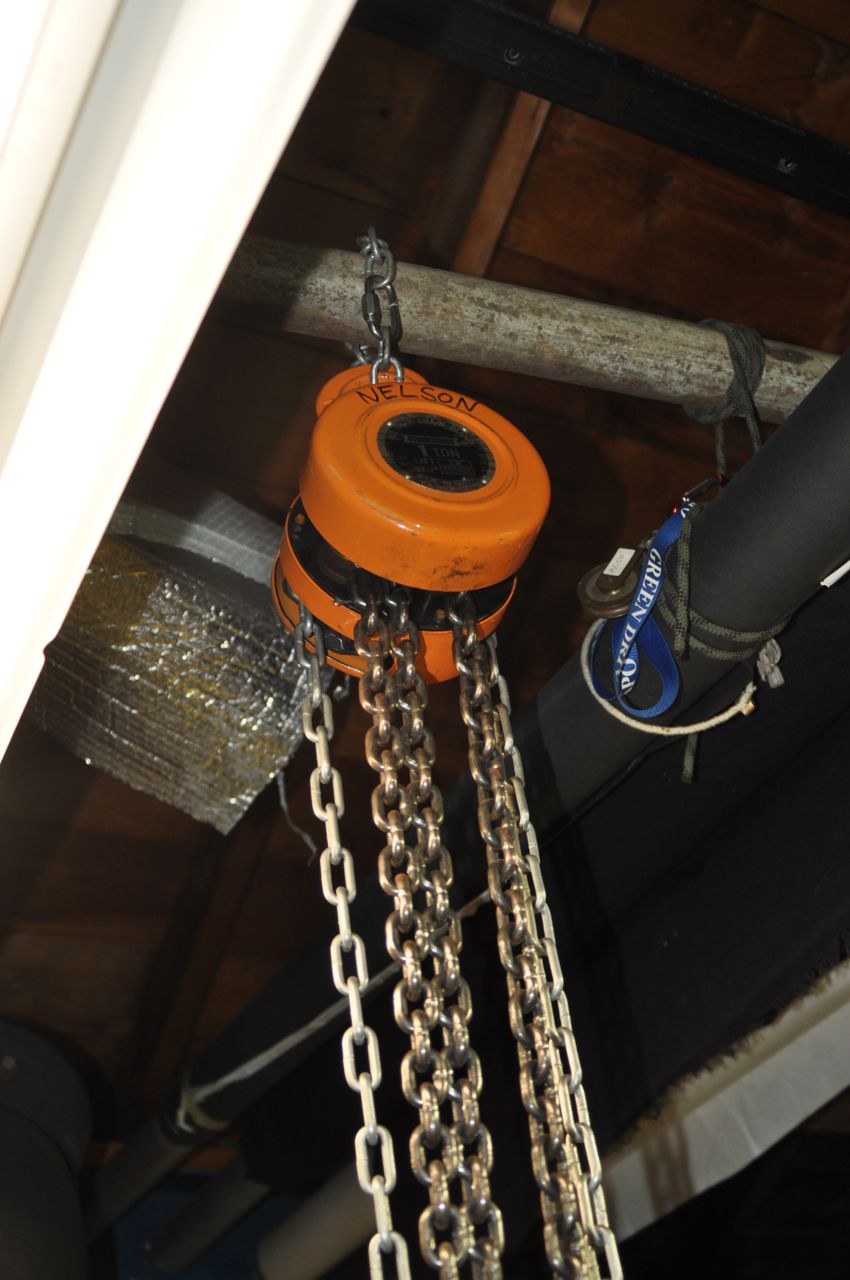 I slid the battery off the tailgate and onto the janky A/V cart. Carefully, I rolled it into the garage, trying to keep it from tipping while going over not just the bumps, but also the cracks in the concrete big enough to lose a wheel in. At this point, the cart was starting to lean, and the one crack in it was looking larger than usual. Fortunately, I made it over to my chain hoist.