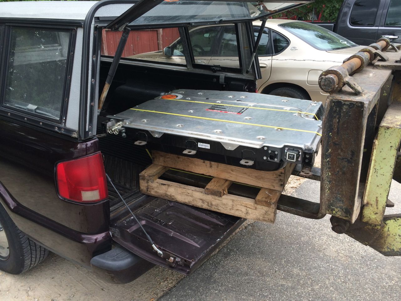 I paid for the transmission and battery and the guys strapped down the battery pack to a mini pallet and loaded it in the back of the truck. “Come back here and see us when you finish that hybrid truck project” was the parting words from the salvage yard.