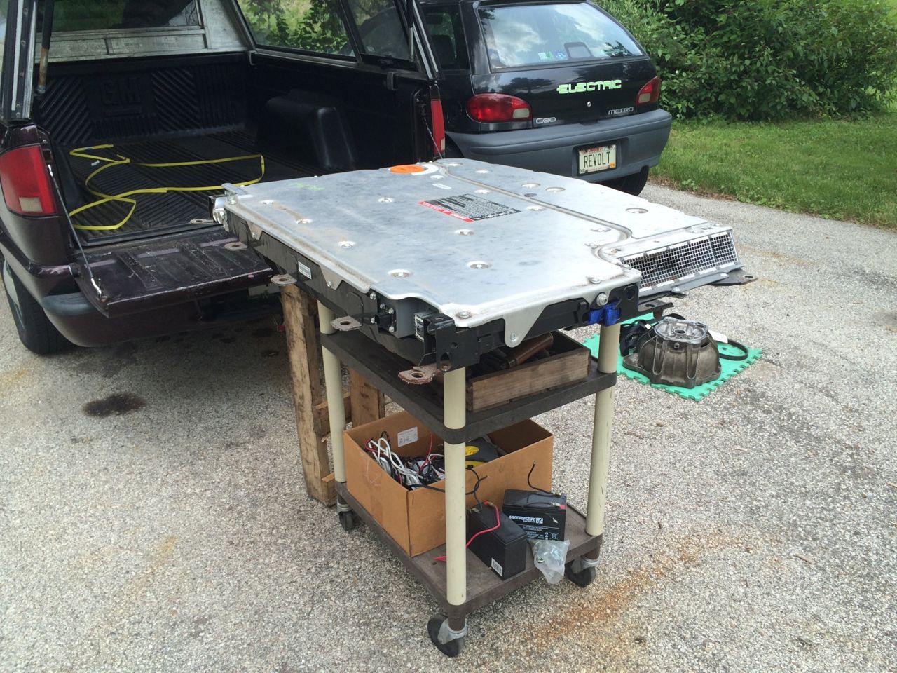 Although the trip home was otherwise uneventful, I did still have to figure out how to get the battery pack out of the truck. It weighs about 200 pounds, and is an awkward shape. I didn’t have a forklift, but I did have a plastic cart that was about the right height.