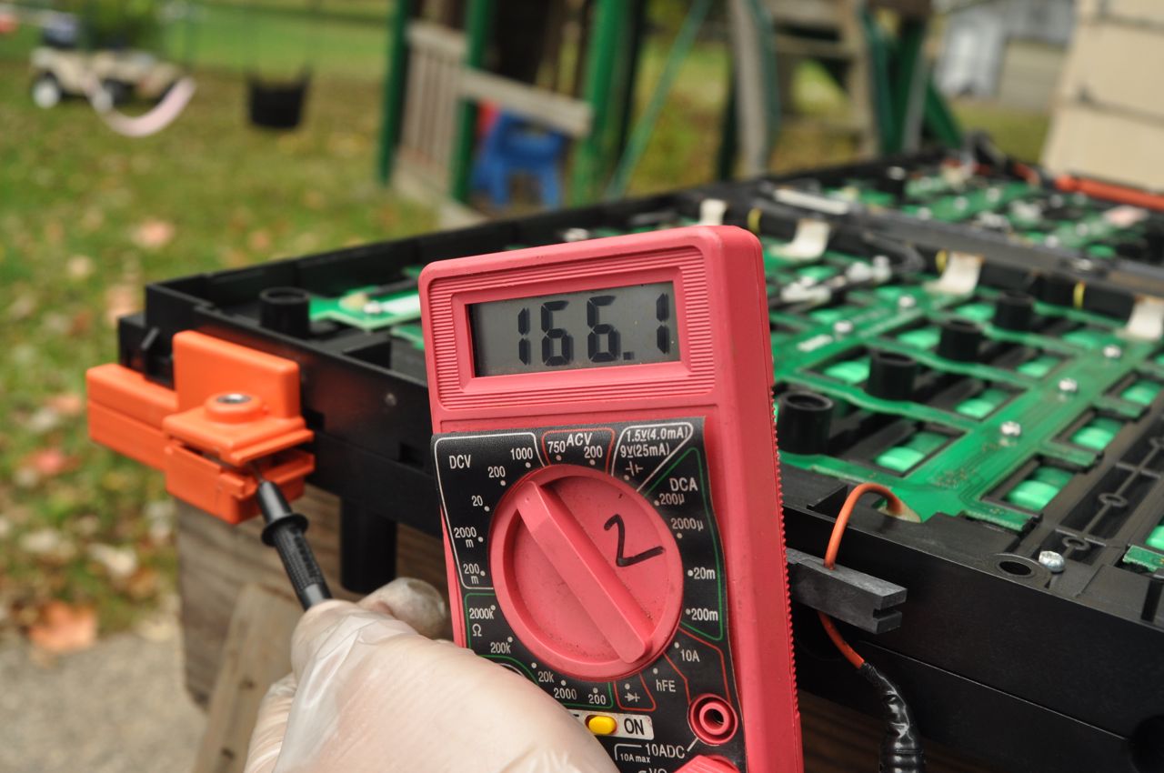 On top of the cells was an array of sensors – temperature sensors and a large circuit board for cell management, held in by about a zillion screws. I set to work removing them. I also tested the block of cells with my volt-meter and found that this half of the pack was at about 166 volts, which sounded about right for a full charge.