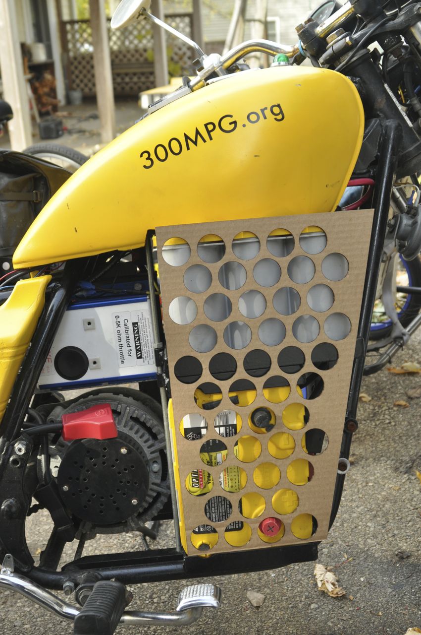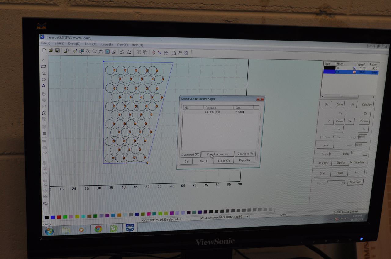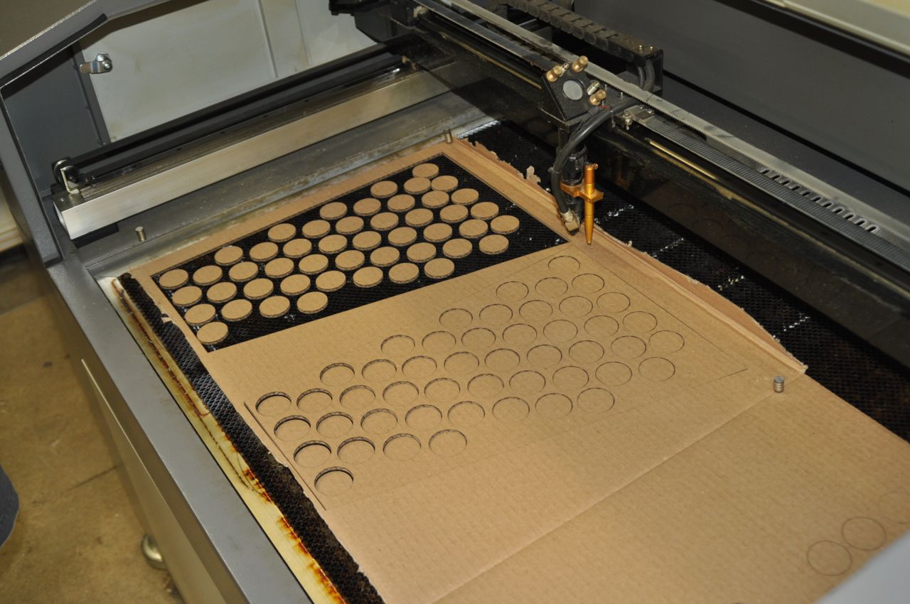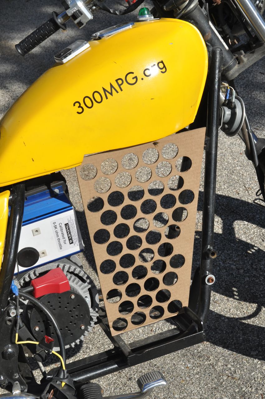 Back to the drawing board, I’ve seen cylindrical cells mounted through sheet plastic with round holes cut in it. Would this work for my project? Who knows? The only way to find out is to try it. I measured the diameter of one of the cells, and then drew that as a circle on a computer drawing program. I duplicated it 47 more times, trying to arrange it to fit inside the rough shape of the motorcycle frame. That done, I saved the file and took it over to a friend who has a laser-cutter. We put some scrap cardboard in the cutter and used it to carve the holes out of the cardboard.