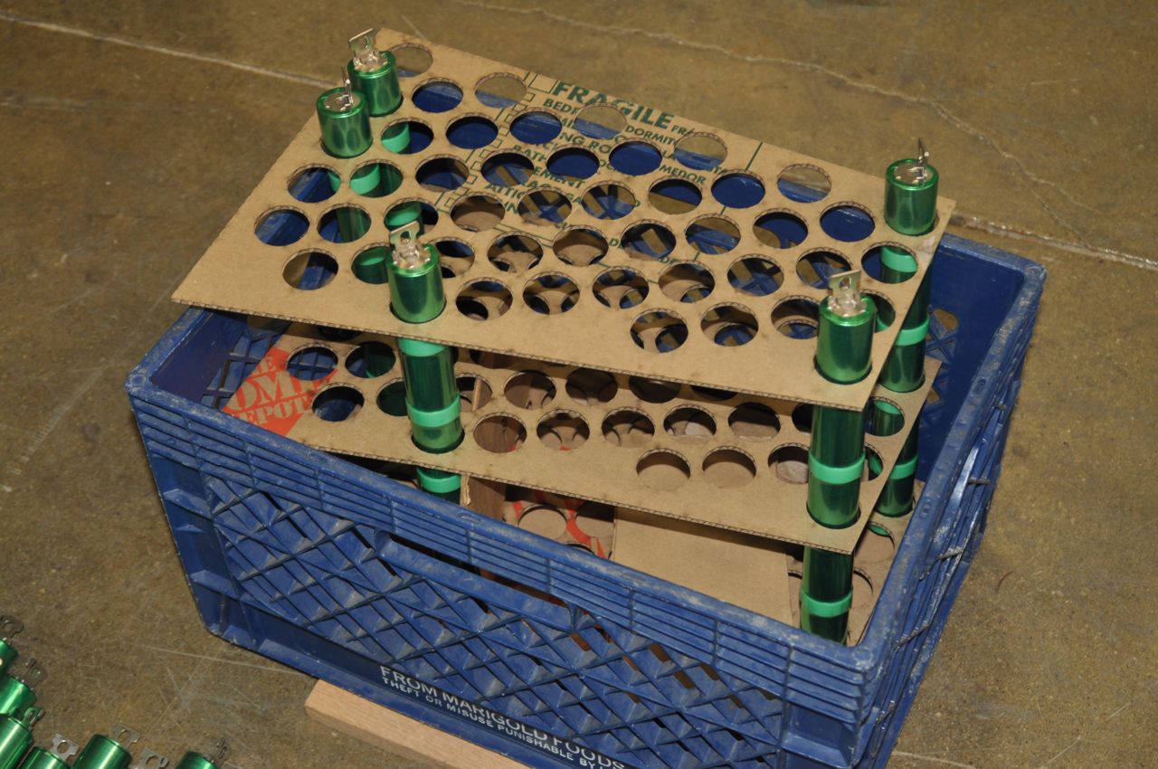 I arranged the cells through the cardboard template inside a milk-crate (to hold the weight) and saw how the cells were spaced out. Overall, it looked like it should work fine, although without the cardboard templates connected to each other, the entire array was floppy and difficult to work with.