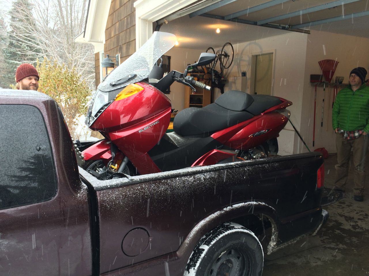 I headed up for a several hours drive towards the Twin Cities to meet with the seller. My buddy, Ryland, lives in a city on the way, so I swung by to pick him up. With a non-functioning NiMH battery pack, it would be helpful to have a friend with to help load the cycle into the back of the truck. Ryland, who is half Lumberjack and half Viking, was the perfect guy to help. of course, it’s also nice to chat and see what his latest project is, in this case, a rocket engine made from old furnace parts. (No Joke. Look for updates on that later this winter.)