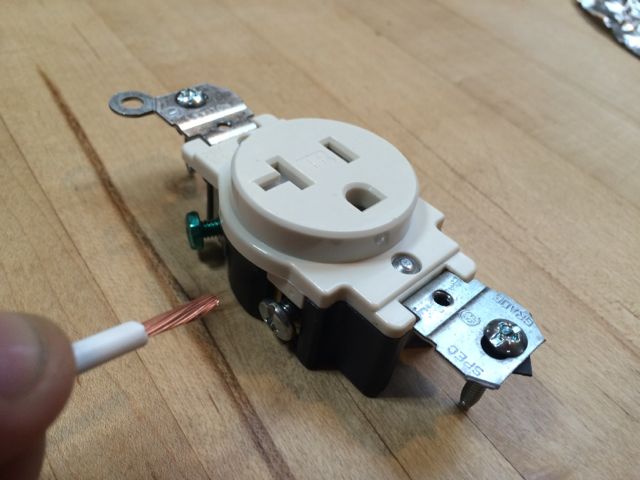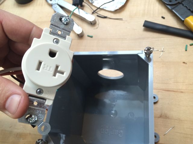 I also purchased a regular old 120V electric outlet, except that this one happened to be rated for 20 amps and was only a single outlet instead of two. I didn’t need a second plug, and it saves space inside the box. I drilled a hole in the side of the box to fit that single outlet.