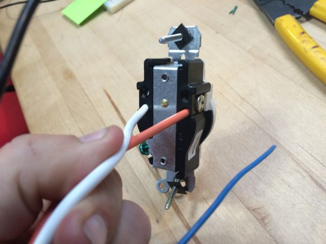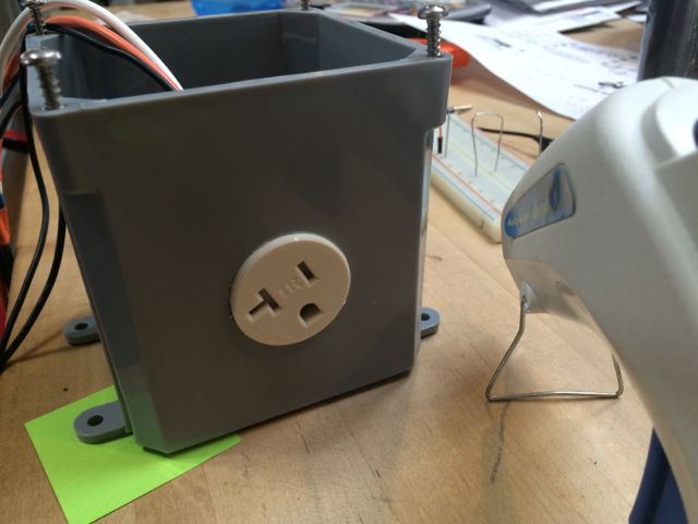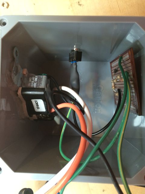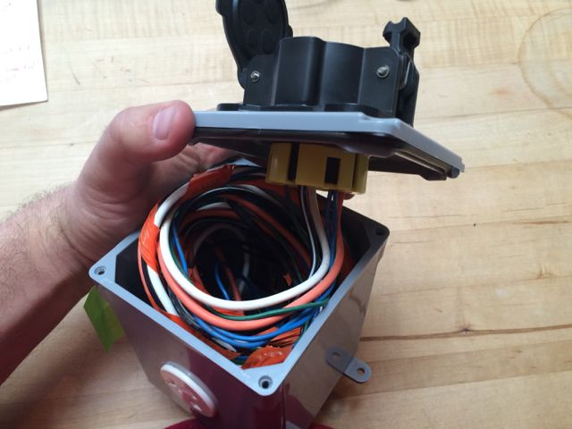 Once I wrangled it in there, I attached the lid with the four screws that went with it. The last step was to add labels, so I would remember which direction was ON and OFF for the switch, and a warning that the 120V electric outlet would actually have 240V going to it.