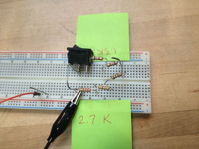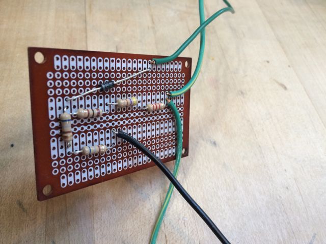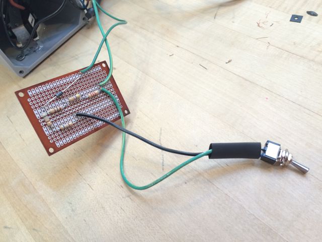 Next, I had to tackle the electronics – if you can call a diode and two resistors electronics. Of course, I didn’t actually have two resistors of those exact values, so I had to put several together to come up with those total values. That meant I had 5 resistors instead of 2. Oh well. Since I was going to have several connections, I first tested it all out on a bread-board. Only after I had it all worked out did I transfer the components to a small project PCB board and solder them. On one side of the board was a 1N4003 diode, going to 2.7K ohms of resistors. On the other side was 1.3K ohms of resistors, the a switch, and then the parallel connection to the end of the other half of the circuit.