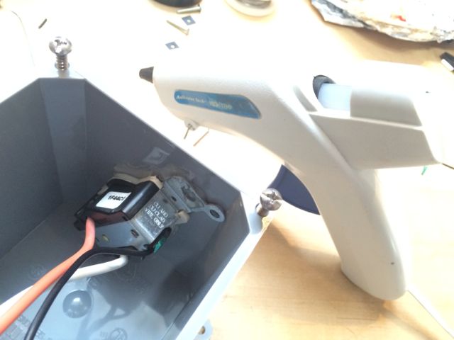 I mounted the circuit board inside the box, against the side, with hot glue. The J1772 connector was hot-glued to the inside of the lid, and the electric outlet to the side of the box.
