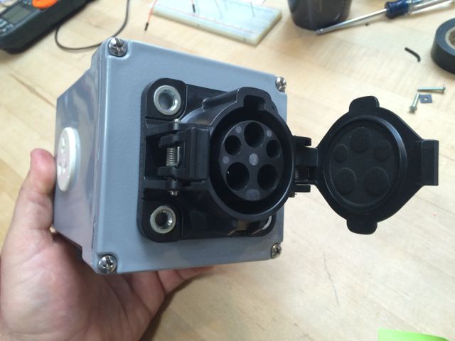 I had already hit the hardware store and purchased a 4″x4″x4″ marine grade electrical junction box. I drilled a hole in it’s lid with a hole saw that matched the J1772 connector.