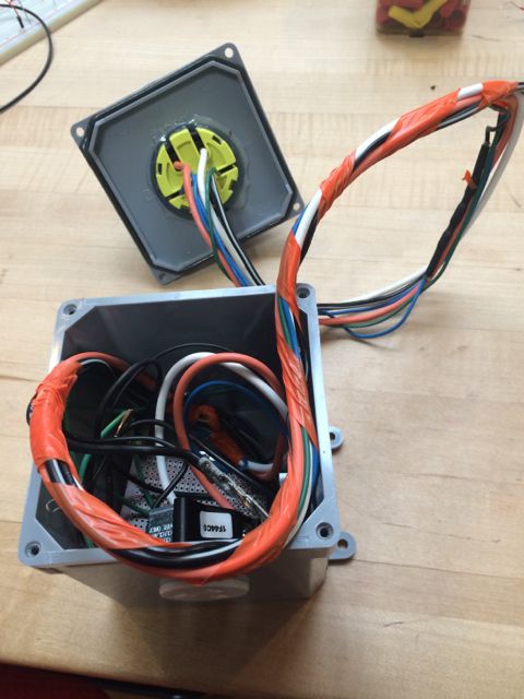 With the components all mounted in place, the next trick was to fit all the wiring inside. The J1772 connector still had several feet of wire on it. Part of the reason why is that there was already some properly done splicing of a ground cable part way down. Also, who knows, maybe I will need some longer wire for a different version of this adapter. The point is I still had several feet of wire to wind around and squeeze into this four-inch-square box.