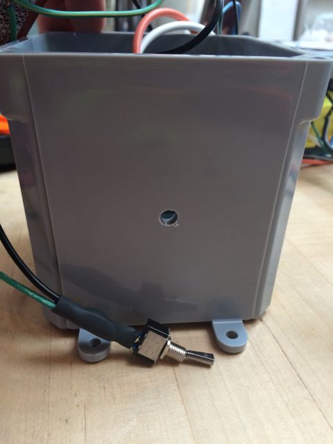 I drilled a small hole in the side of the box, pushed the toggle switch through, and mounted it in place by tightening the nut.