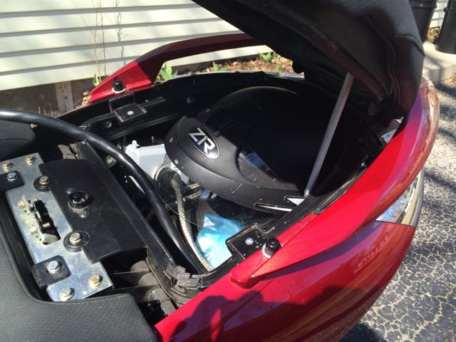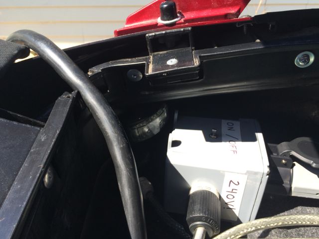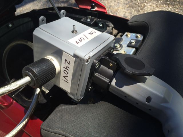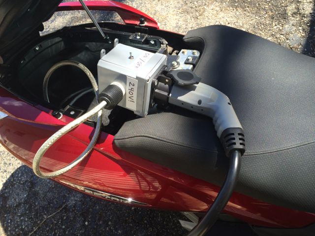 I played around with the position of the adapter box in the trunk of the Vectrix. I was able to arrange it so that I could have the adapter in the trunk with the EVSE plugged into it AND fit my helmet in there, AND close and lock the trunk. The cord goes out through a notch in the edge of the trunk designed for such a purpose. The EVSE cable is thicker than the regular charging cord, so it’s tight, but it does fit!