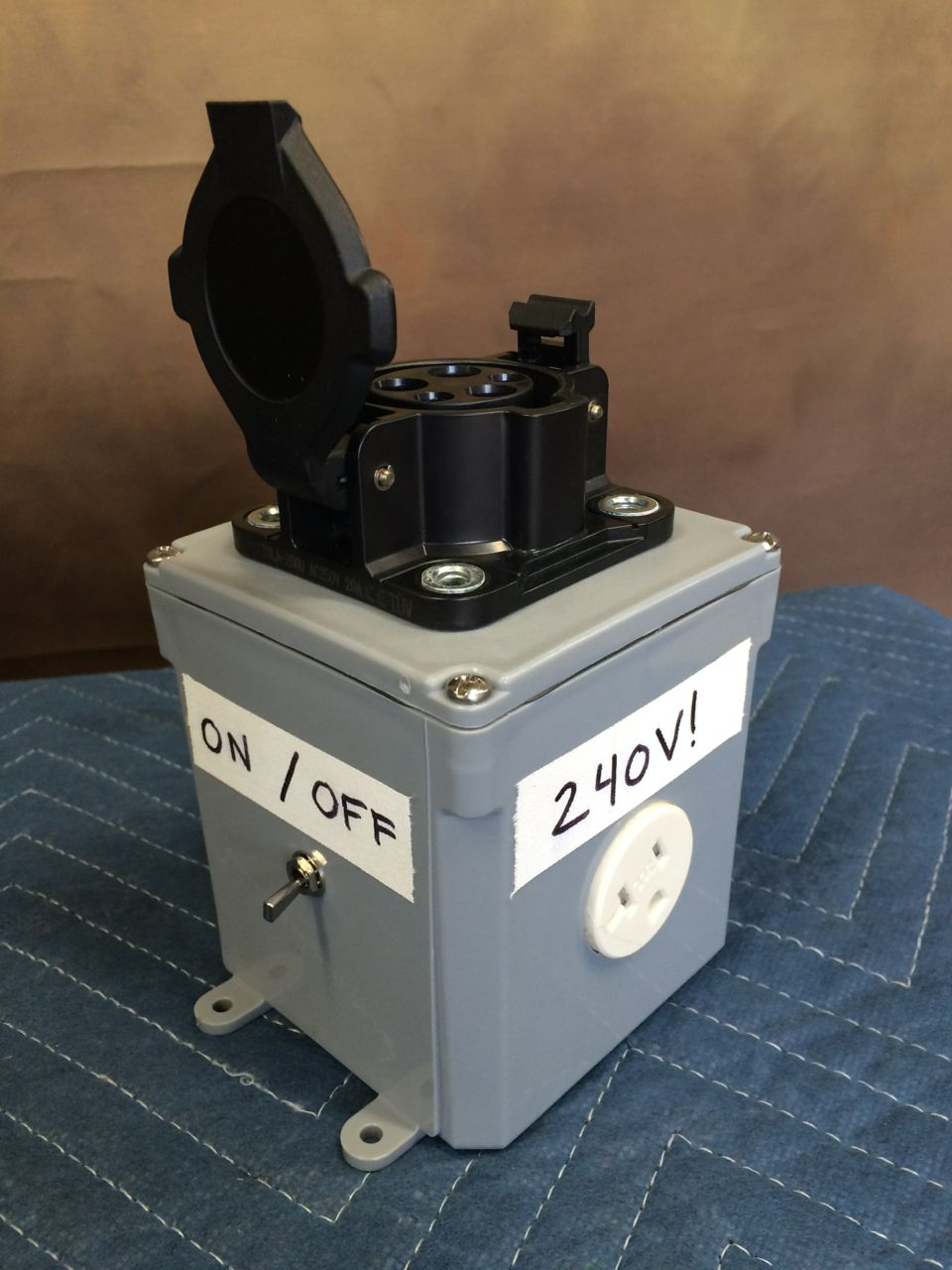 Everything I had heard lead me to believe that the charger on the bike is much like a modern computer power supply – it will run off AC power from a range of somewhere between 100-250V or so. I already have a 240V electric outlet in my garage, used for a welder. It’s a 30-amp twist lock connector. I looked around, and sure enough, I actually already had all the parts I needed to build an adapter that would physically connect the 30 amp twist lock to a typical 120V electric outlet.