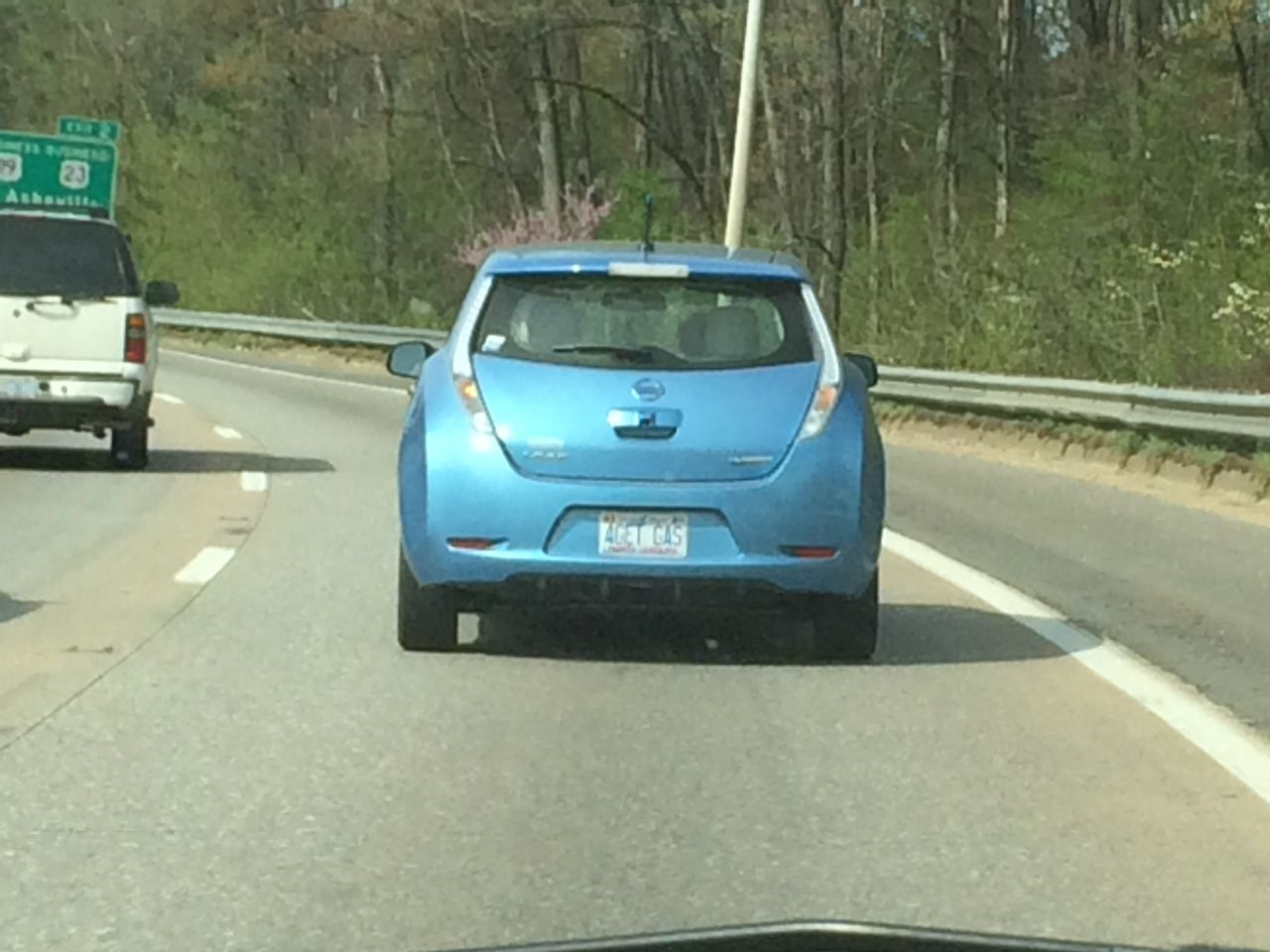 I had a great time at the Fair, and I hope that you did too! I even got to meet up with a relative I haven’t seen in a long time, and we went and saw downtown Asheville. On the way out, I saw a Nissan LEAF on the freeway with the custom license plate “4GETGAS”. What a trip!