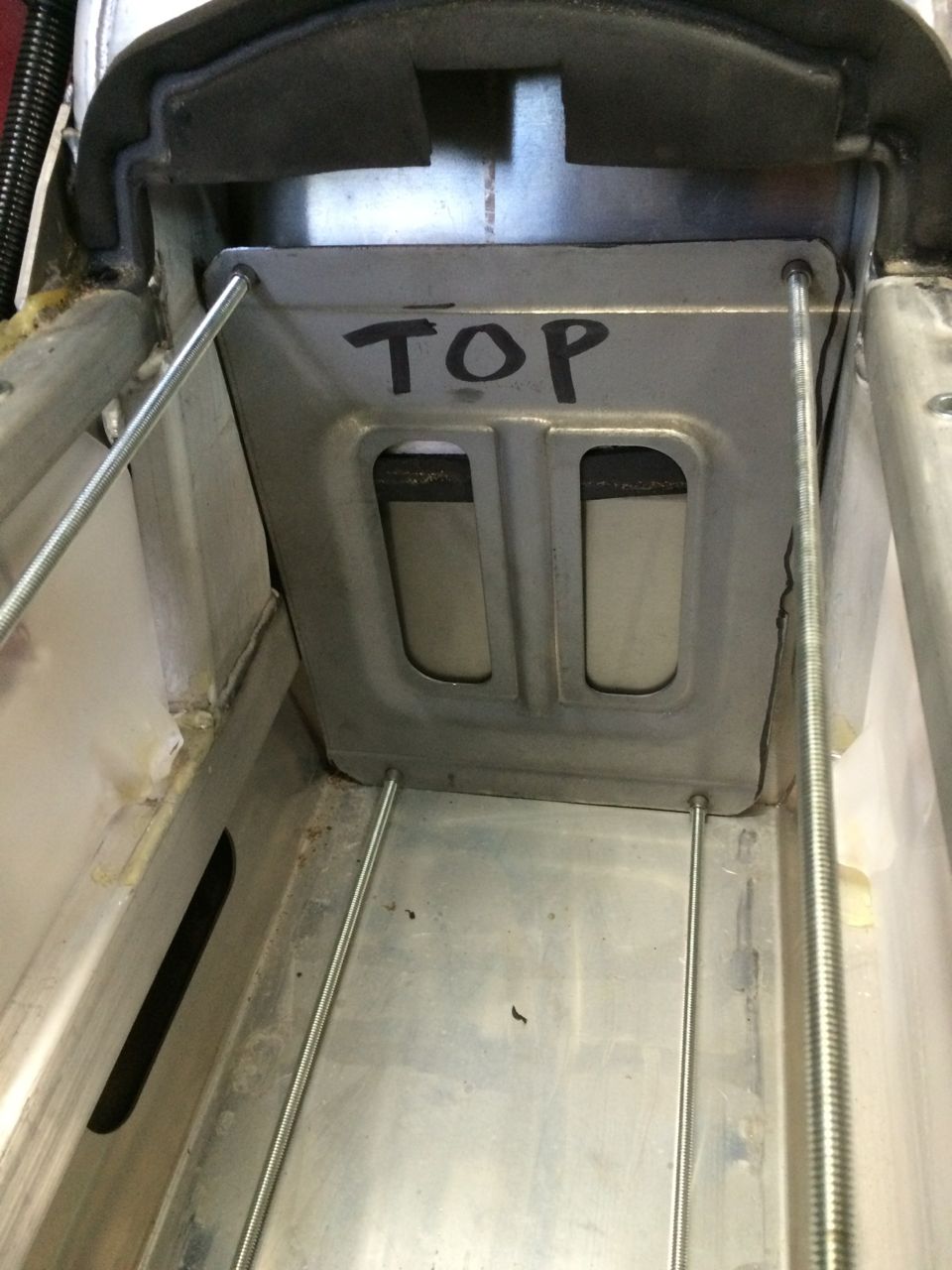 To start with, I cut one of the bottom plates from the battery pack down to just one cell module wide. These plates originally held four stacks of cells on either side of the battery pack. A cut-off wheel in an angle grinder zipped through the steel pretty easily. The plate already has threaded holes in it – 6mm – for the long bolts originally used. The rear section of the battery pack had a set of long threaded rods (also 6mm) but the threads were only on the ends. If I cut the rods short, for my 18 module battery pack, the threads would be gone on one end or the other. Also, I don’t have any equipment for machining threads on to rod. In addition, metric parts in the United States are still oddly expensive at any local hardware store. Threaded rod measured in fractions of an inch is cheap, but in mm it’s pretty pricey, and that’s only if you can find it.