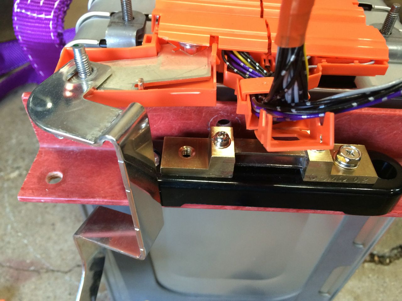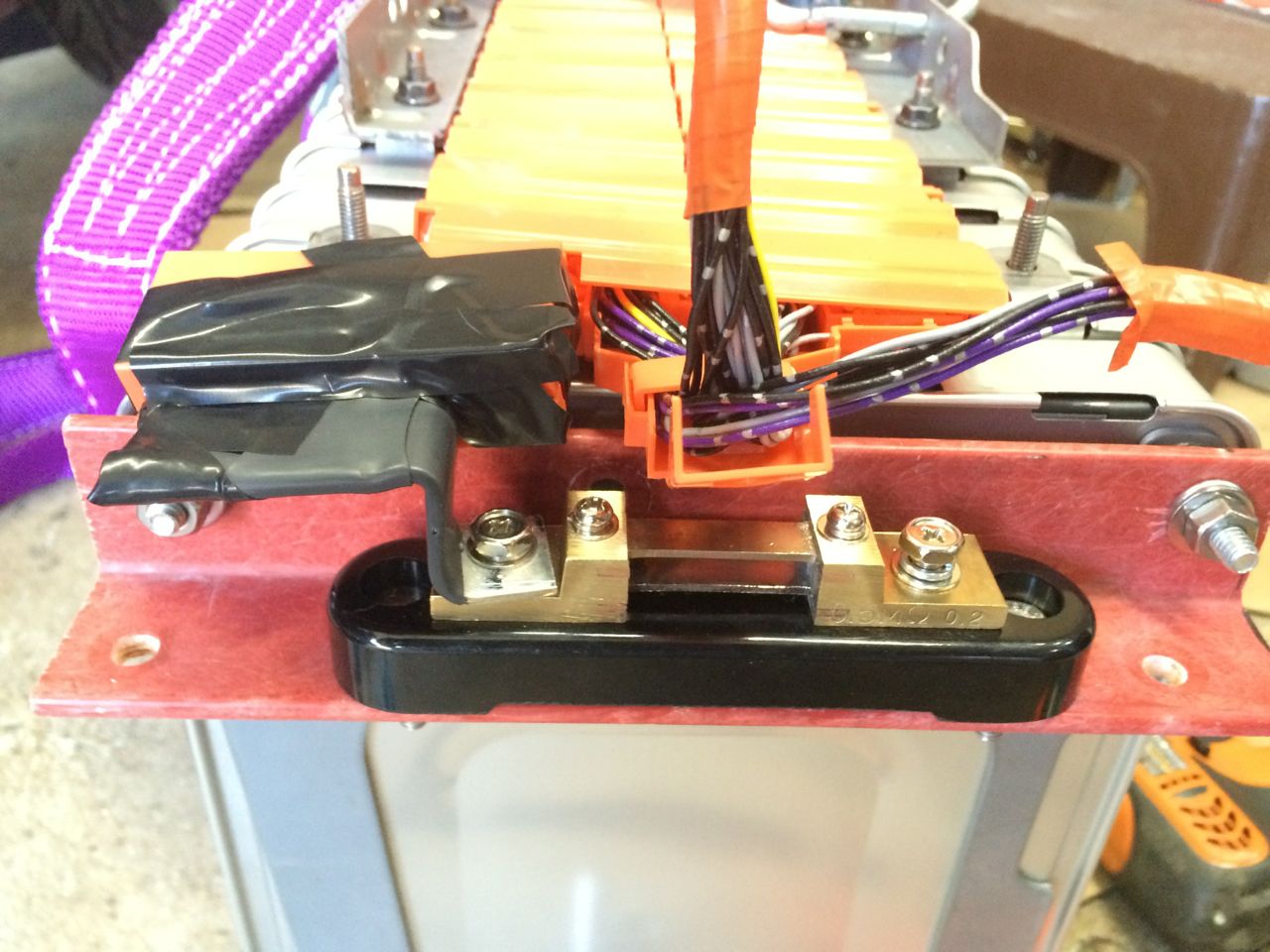 Next, I mounted the ammeter shunt to the fiberglass angle with a pair of 1/4-20 bolts. To electrically connect pack negative to the shunt, I repurposed one of the original Nissan LEAF pack bus bars. I removed the orange protective cover, bent the bar to shape, drilled a hole in it to match the shunt, and added a section of heat-shrink tubing. Then I connected the bus bar from pack negative to the shunt, and tightened down both bolts.