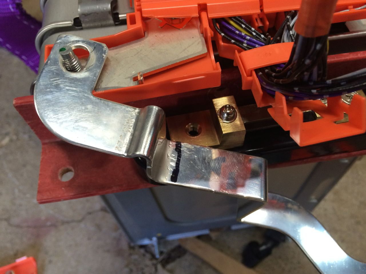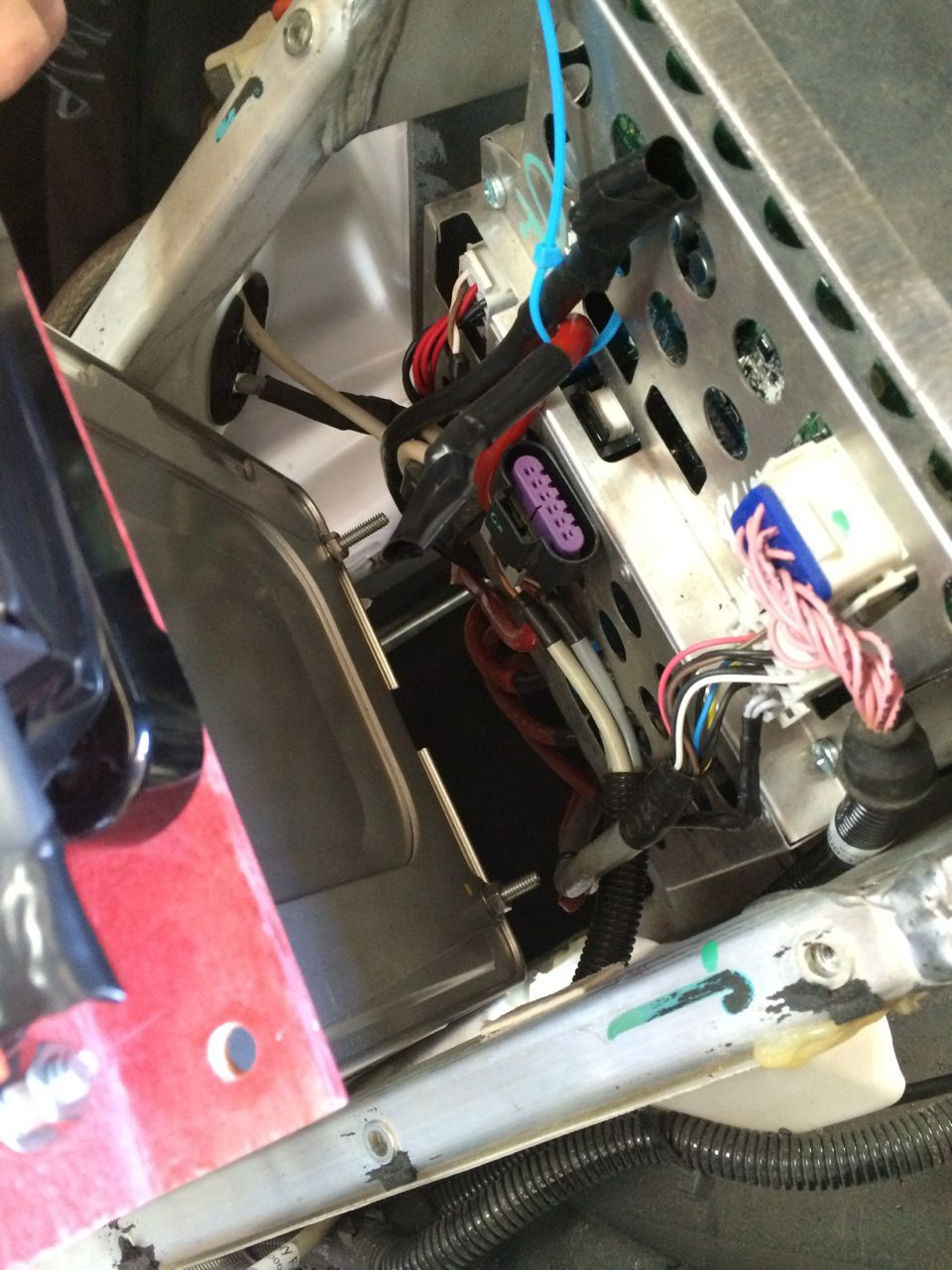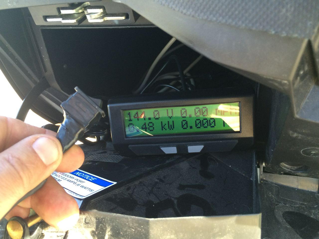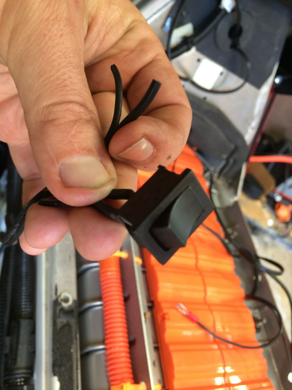 To wire the Cycle Analyst, I threaded the cord through the glove-box hinge, through a frame grommet hole, and into the battery compartment. The Black and White wires connect to one side of the shunt, and the Blue wire to the other side. That only left the Red wire, which had to be all the way in the FRONT of the battery box. I stripped out the red wire, only to find that there was also a yellow and green wire cut off and hidden inside. Pulling on one of those wires was an easy way to split open the cable sheathing. I had another cord which was two conductors. I stripped both ends of both conductors of that cord. I then crimped the red bike computer wire to that cord, and then a very small ring terminal to the same end of the other conductor. That way, I could add a switch to the opposite end of the cord to turn the Cycle Analyst on and off. I screwed down the small ring terminal to the positive end of the battery pack on the fancy little temperature sensor screw on the + terminal. Both the Cycle Analyst and its power switch are temporarily going in the glove box until I decide where I want to permanently mount them.