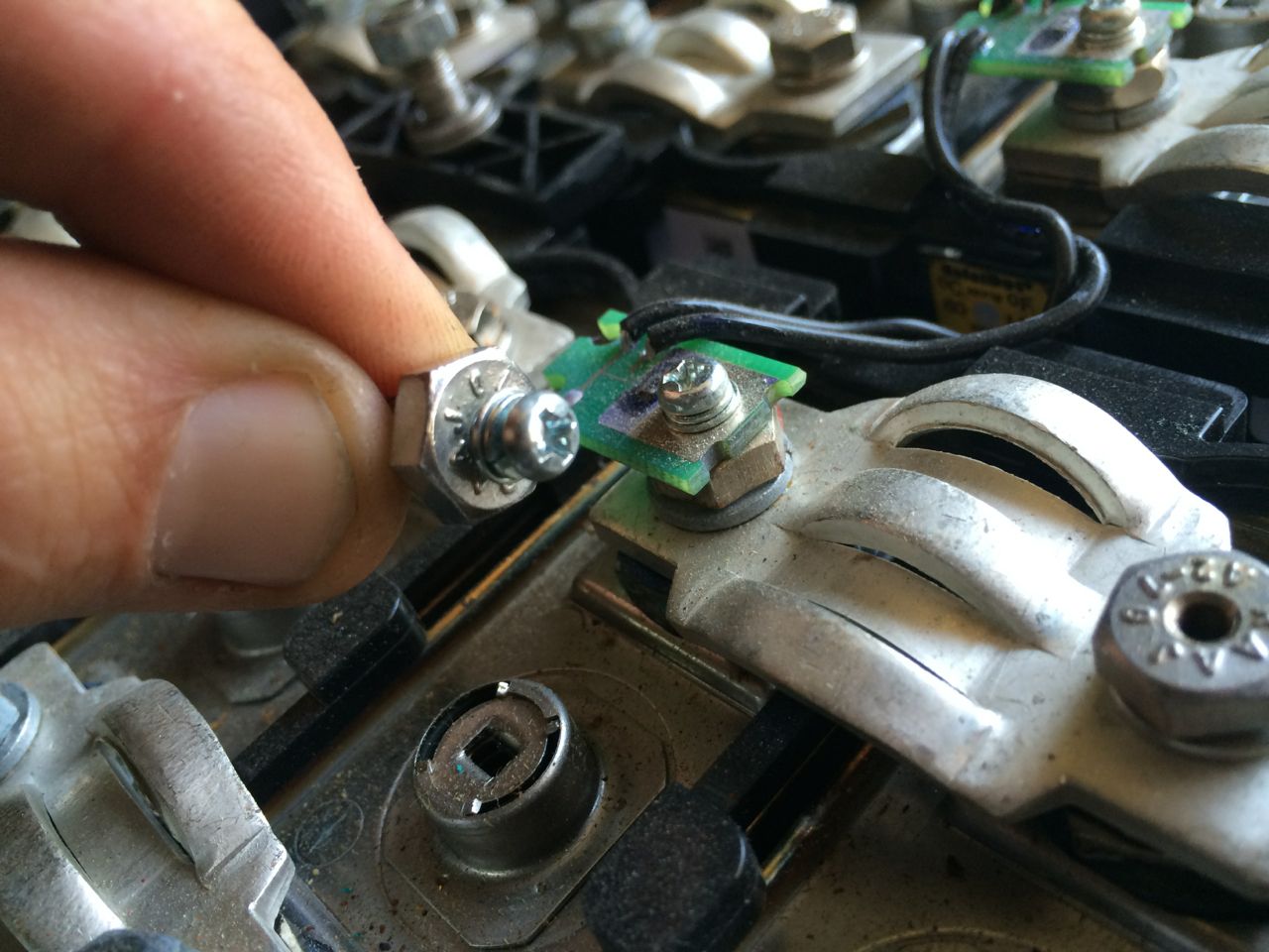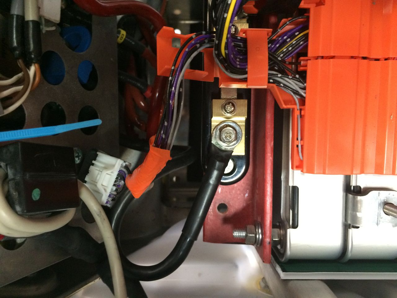 On the positive end of the pack, I planned to reuse one of the LEAF pack main power cables. I also needed to attach a very small wire to the positive end to power the Cycle Analyst. I noticed that the original Vectrix NiMH battery pack used the same size bolts as the LEAF cells, and that a few of the terminal bolts were tapped for tiny screws that mounted the temperature sensors. I removed one of those bolts and used it to attach the cable to the LEAF pack. The tiny screw in the head of the bolt will later be the power connection for the bike computer.