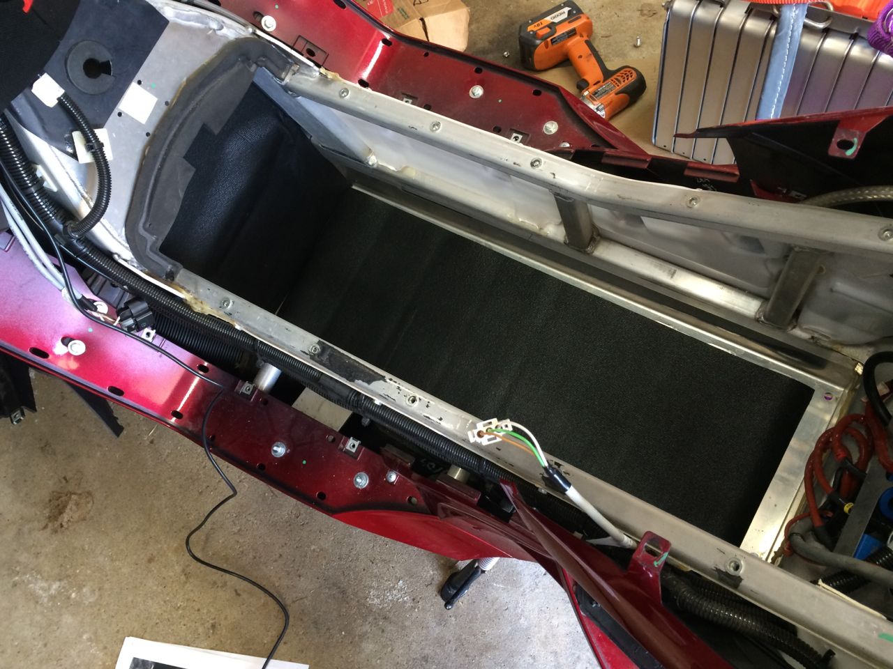 After that, it’s just the less exciting process of reinstalling the battery cover, trunk switch, trunk release plate, trim cover, and seat. I DID remove the fans from the underside of the battery box cover. The LEAF cells do NOT heat up the way the original Vectrix NiMH cells did, and the upgraded charger software actually disregards the fans and the temperature sensors.
