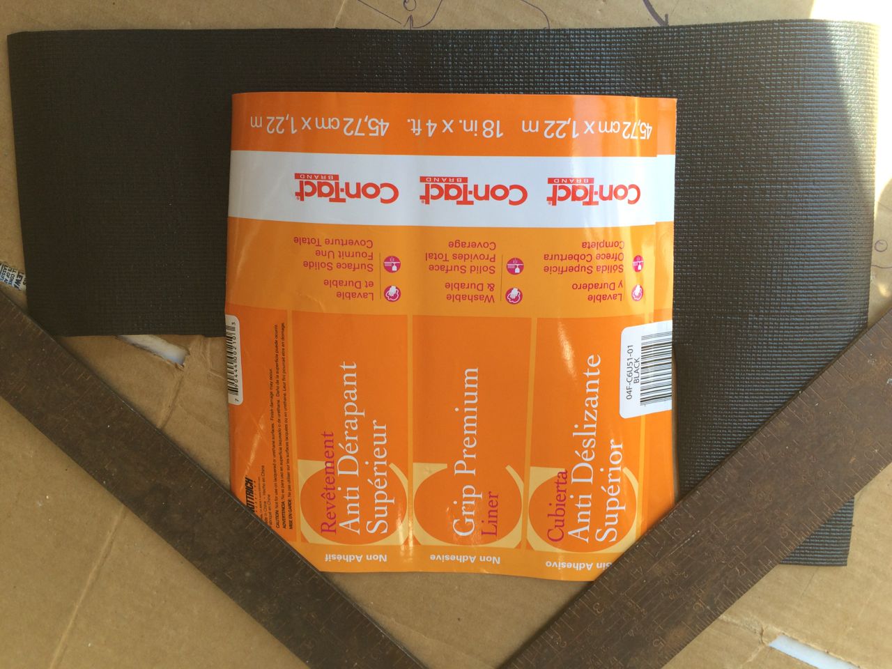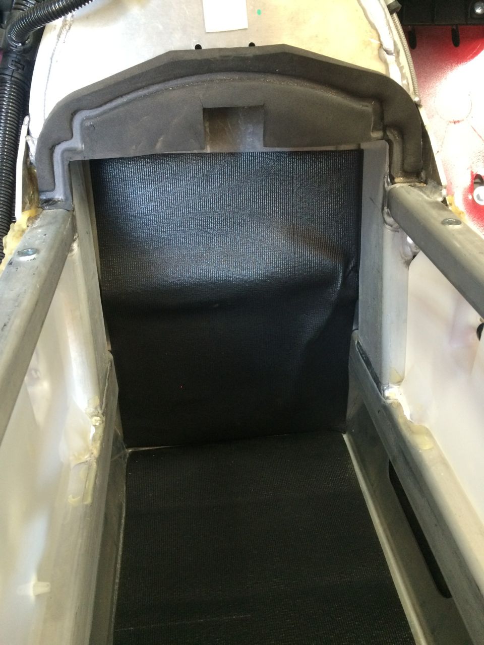 I was also trying to decide if I wanted anything between the cells and the bare frame of the scooter. I had some fancy “Tool Box Anti-Slip Material” and cut some out to fit the bottom of the box. I also cut a piece to go in the far front of the battery box and held it in place with some 3M Super 77 spray adhesive.