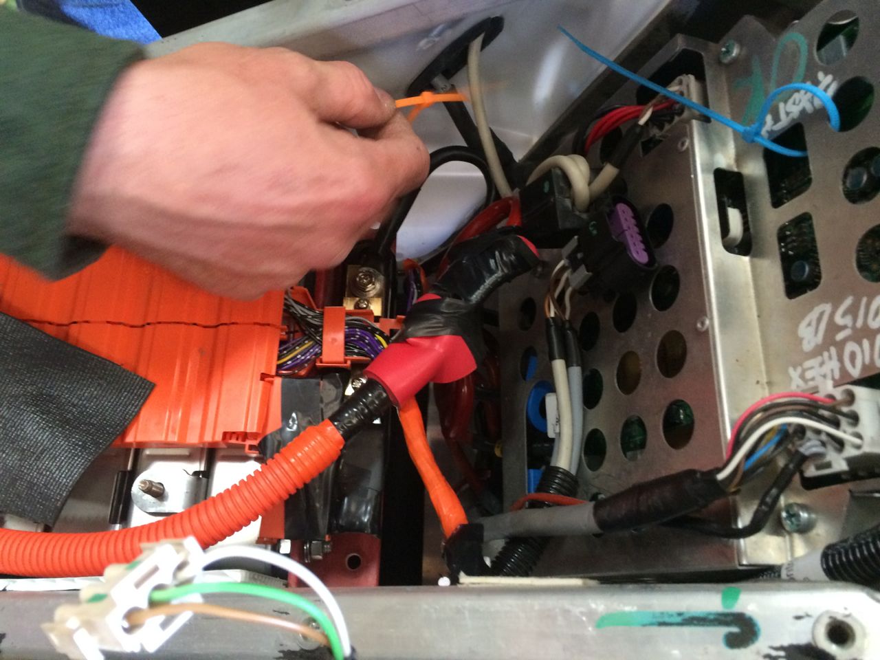 The next big moment is “Pre-Charging” before making the final connection to the pack, in this case the positive cable. I had a 100 watt / 120V lightbulb which I used to complete the circuit BEFORE connecting the positive cables. This lets the capacitors in the motor controller fill more slowly than they otherwise would, preventing a blown fuse or worse. After that, it was just a matter of tightening the connections, making sure they were insulated, and then protecting them from physical vibration (which mostly consisted of zip-tying things in place….)