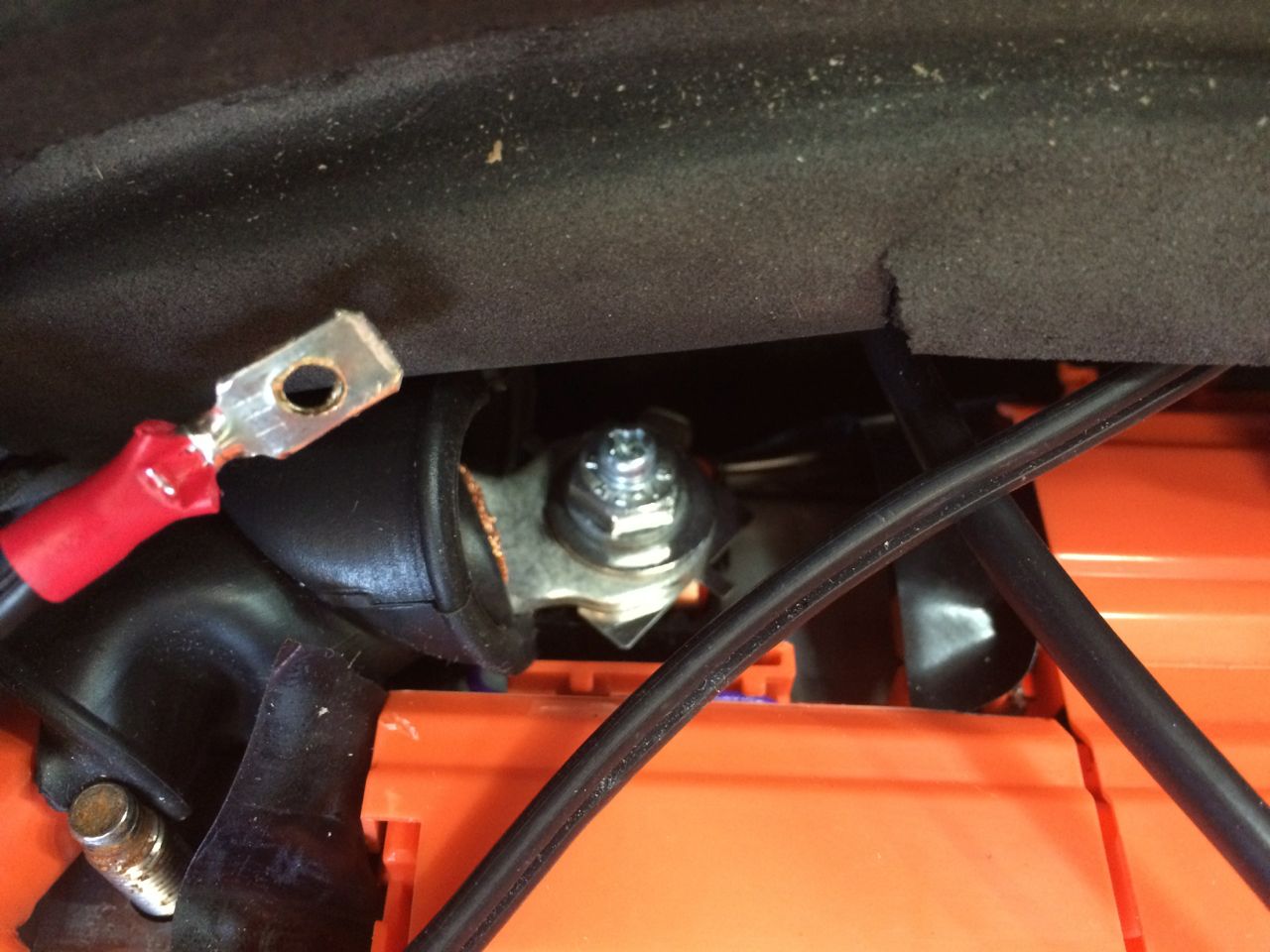 After that, we ran the positive cable along the metal bracket that was on the top edge of the battery, and zip-tied it down. I even happened to have “High Voltage” Orange zip-ties! We connected the black negative cable from the motor controller to the other side of the ammeter shunt and tightened it down as well.
