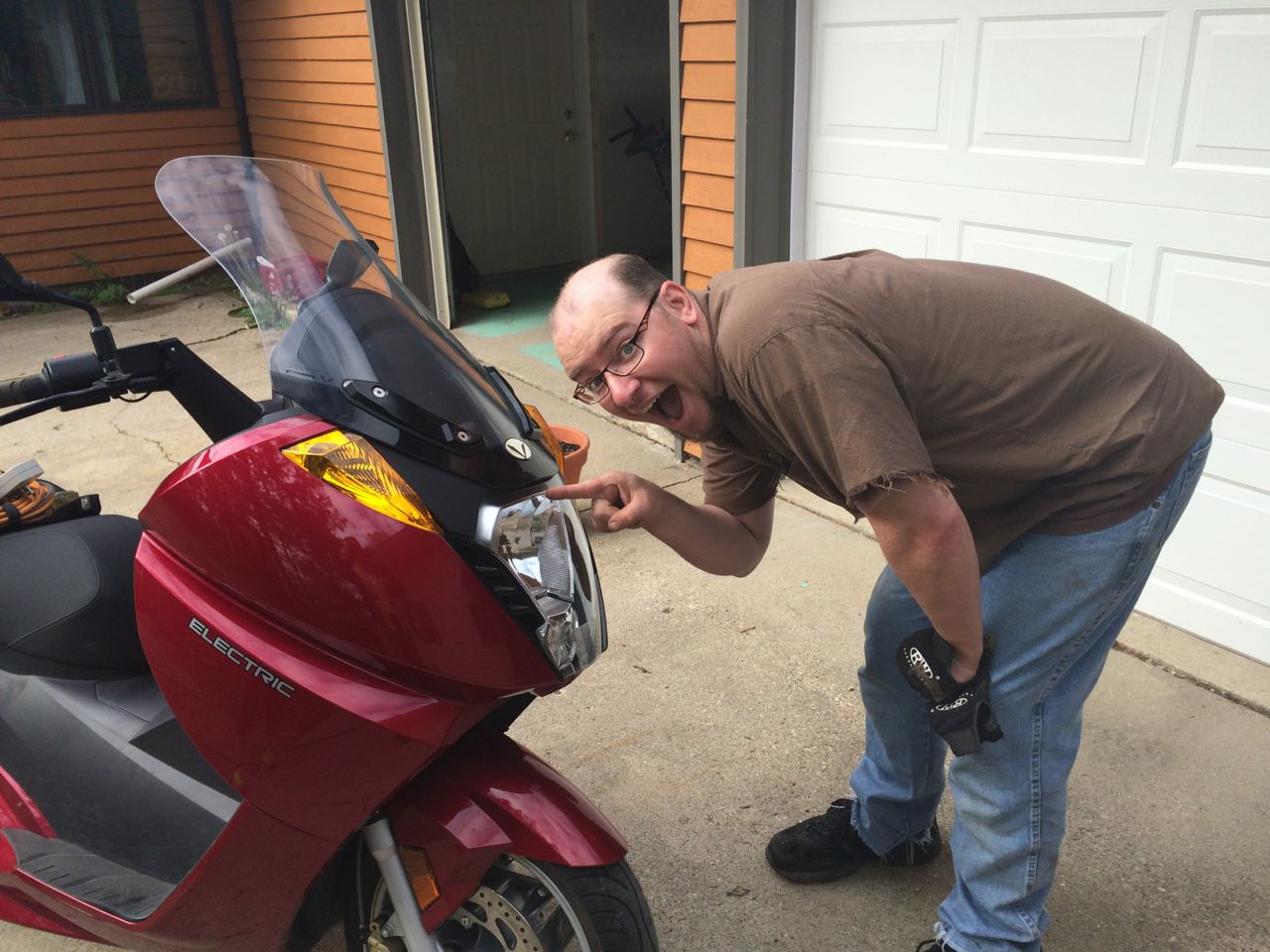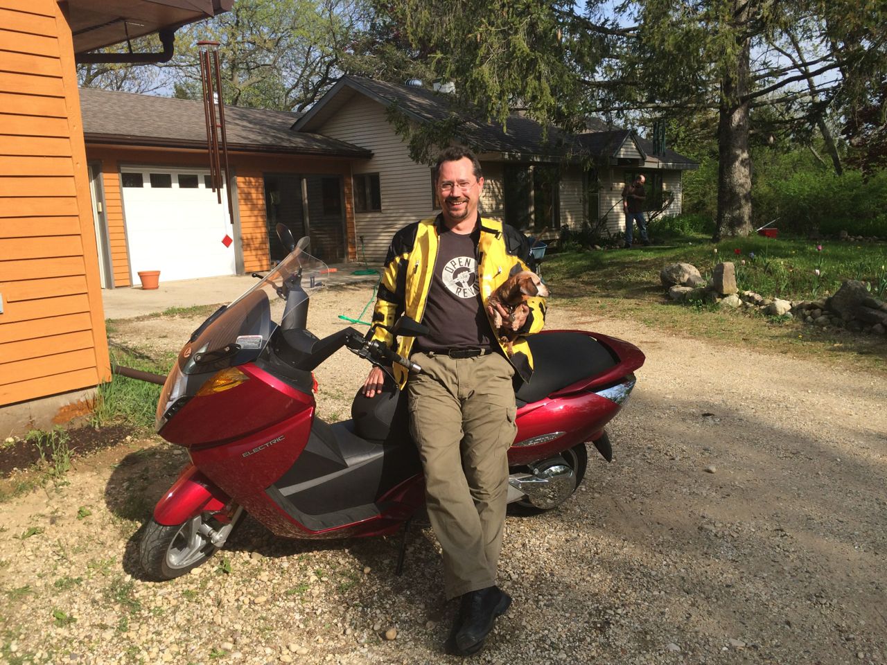 I was headed in the right direction, so I stopped at my sister’s house. Both she and my brother-in-law were at home. He was doing yard work and didn’t notice me until I honked my horn. He could hear gravel crunching, but not the sound of the cycle itself. Fred has always been interested in big scooters, so I knew he would want to see it. The both of them complemented how nice the Vectrix looked.