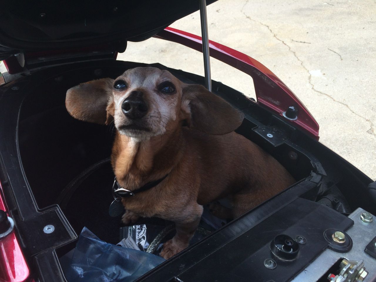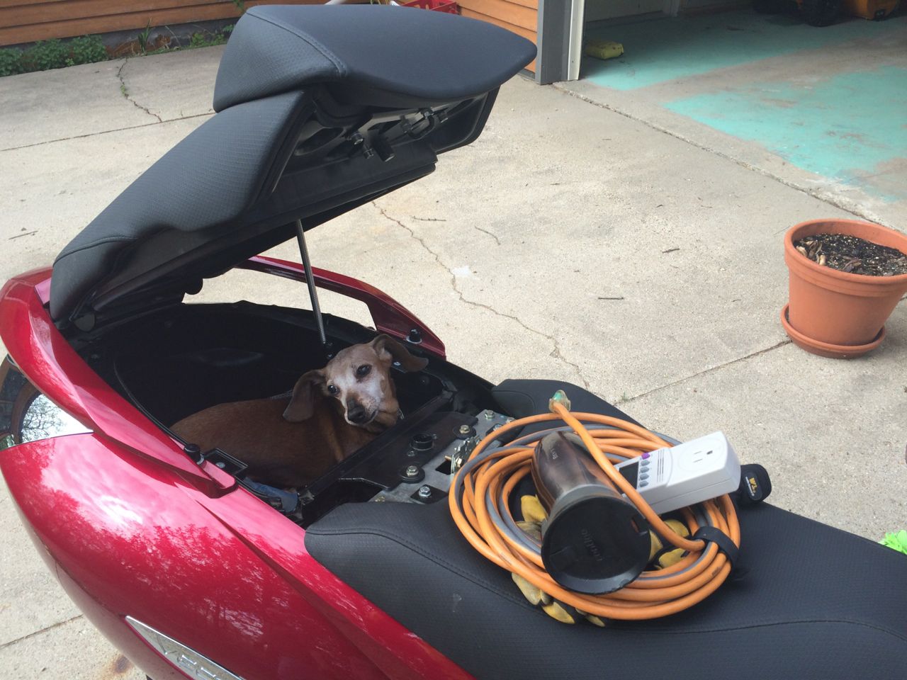 While there, we also checked the trunk capacity of the Vectrix, which as it turns out, is more than large enough for a miniature dachshund.