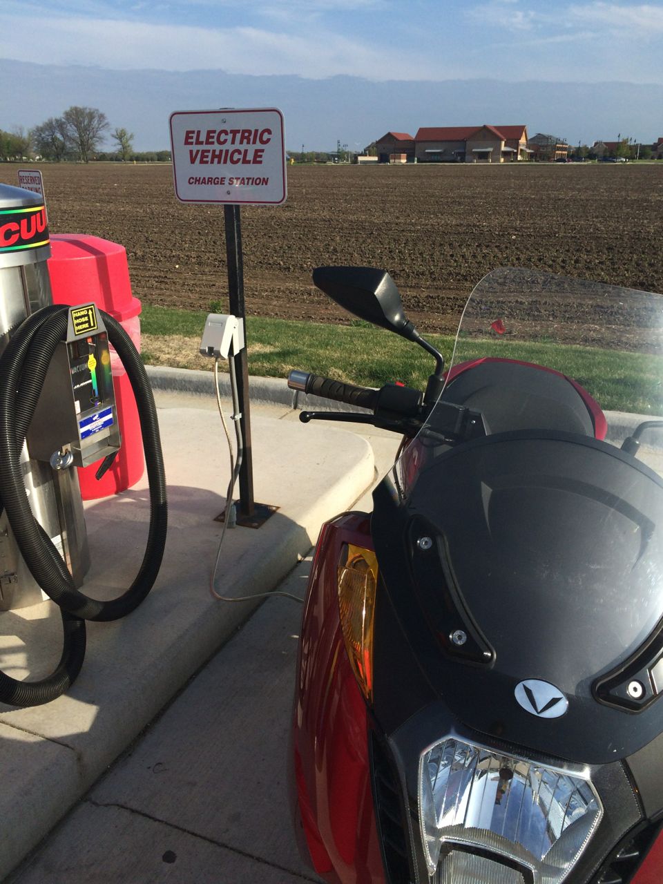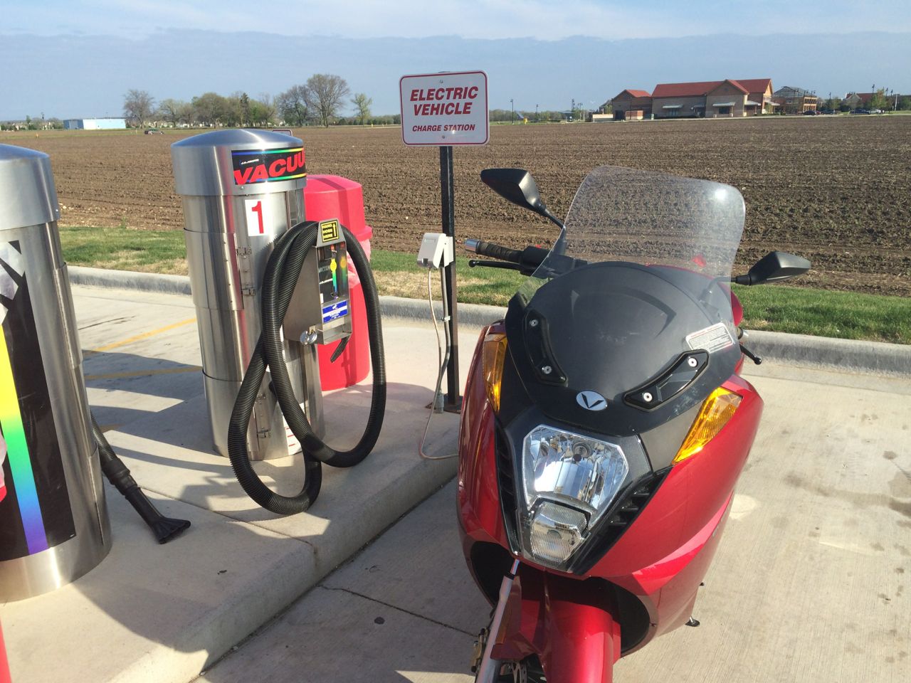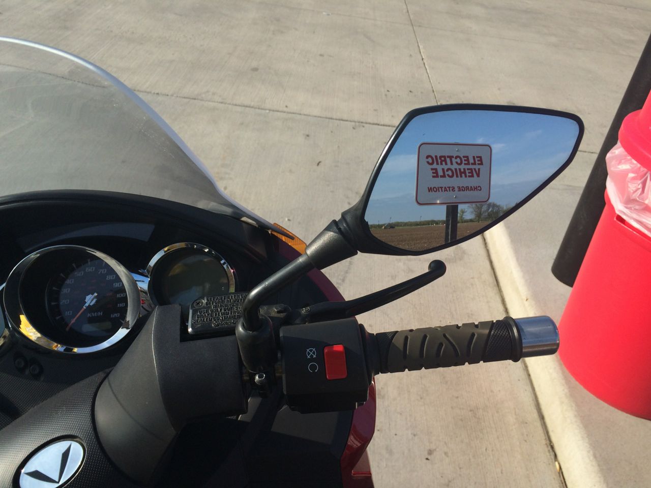 I zipped up to the gas station and headed over near the vacuum cleaner, where the charging outlet was. I backed in, popped the trunk, and plugged the cord into the outlet. I then headed inside for a cup of coffee (Kwik-Trip has good coffee) and a couple of quicky-mart loaves of bread. When I came back out to the cycle, I realized that it was NOT charging! I checked to make sure the plug was pushed all the way in. (It was.) I pressed the TEST and RESET buttons on the GFI. The GFI was fine. I pulled out my Kill-a-Watt and plugged that in. Nothing. No power. There was NO ELECTRICITY going to the ELECTRIC VEHICLE CHARING OUTLET! Hmmm. Seems like a design flaw there. On the other hand, I was probably the first person EVER to try charging there, so probably nobody else would have even had the chance to notice there was no power.