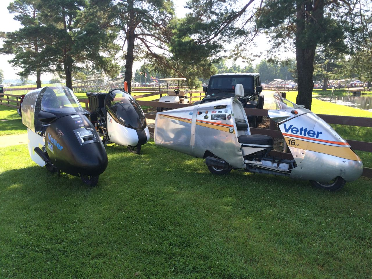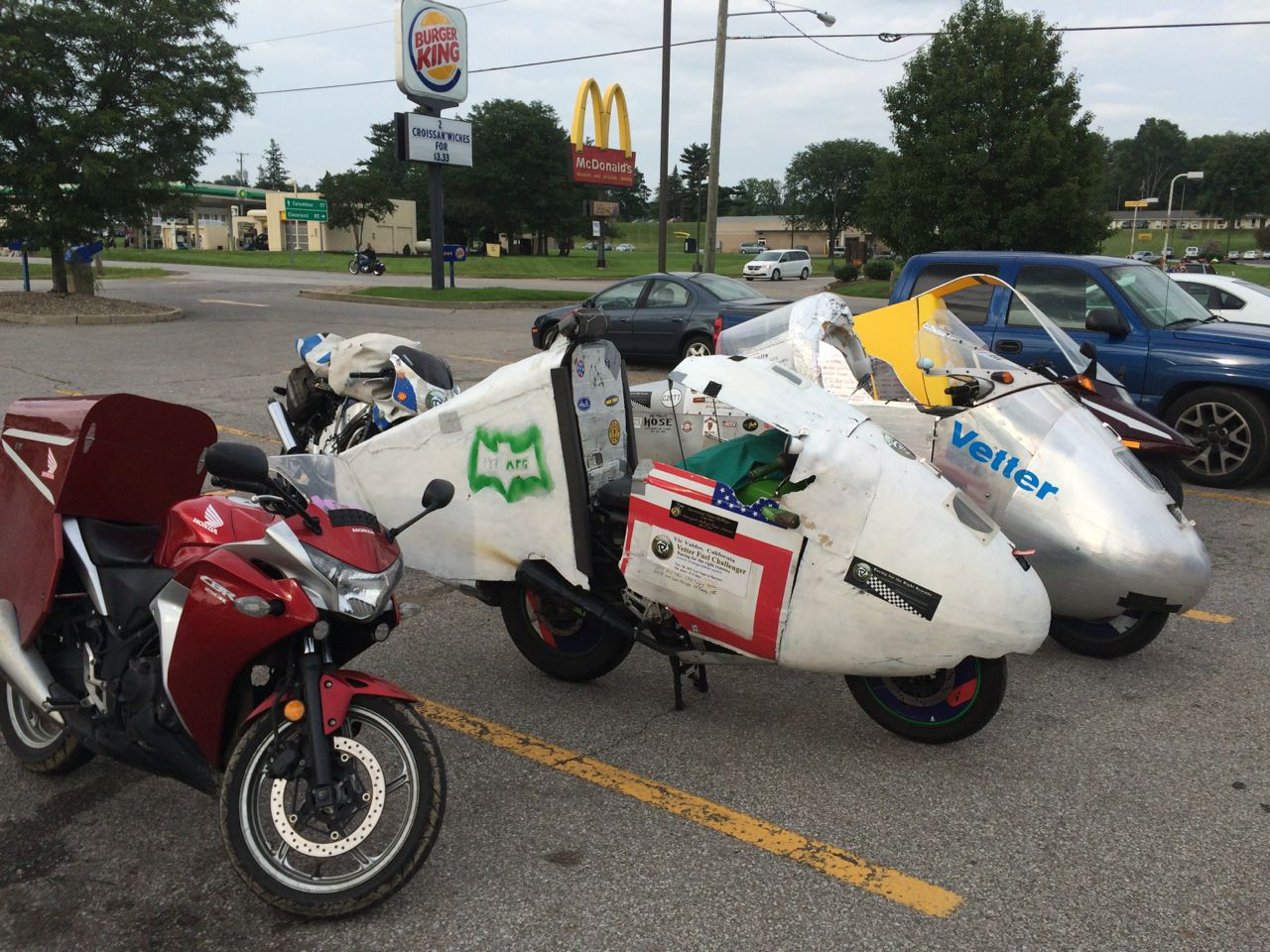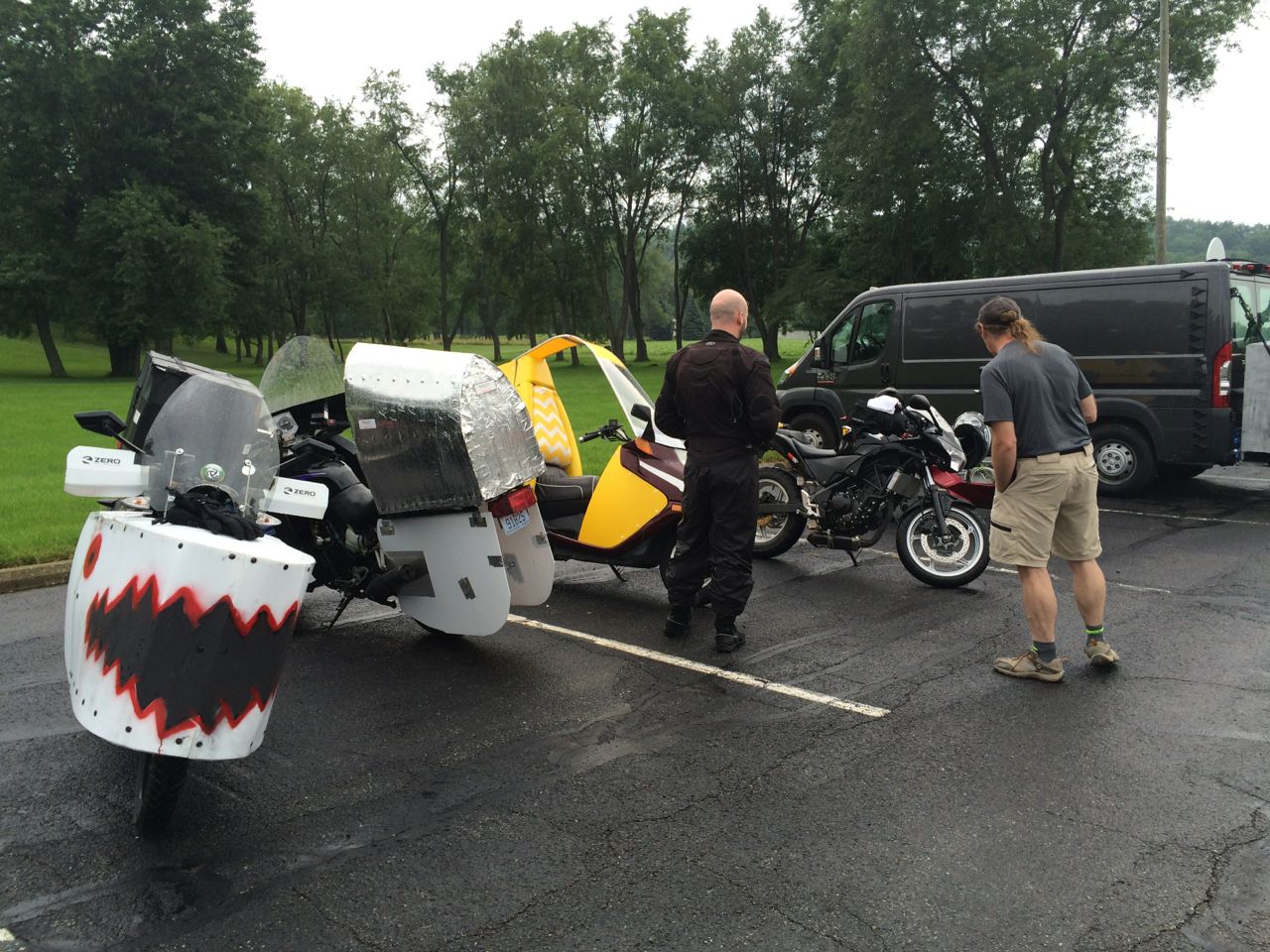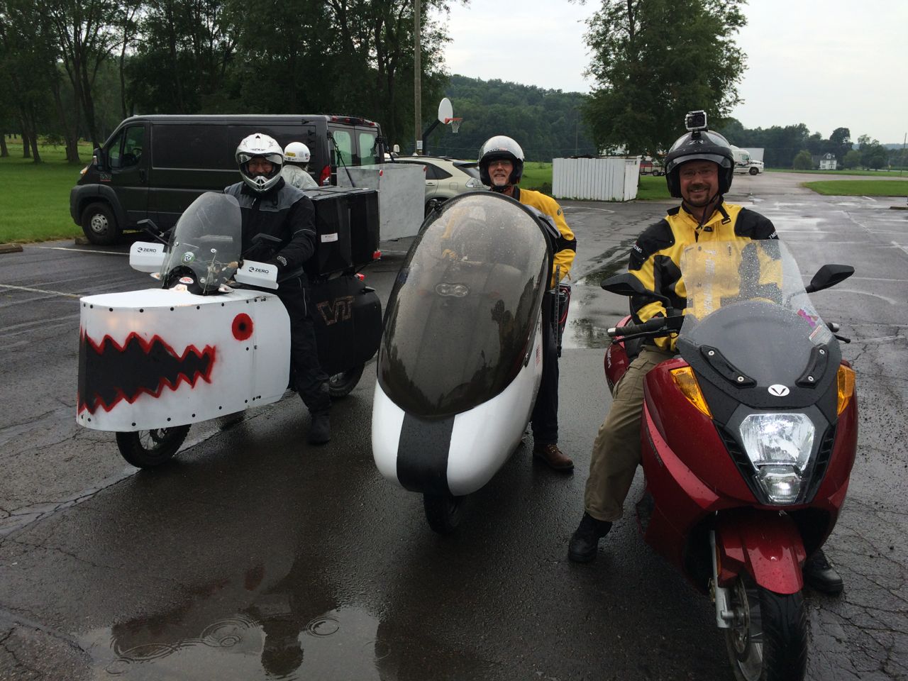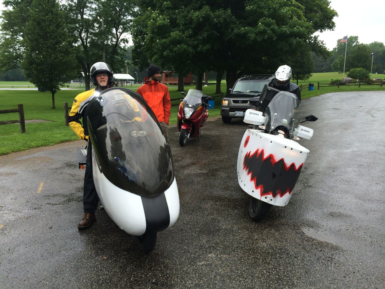 Sunday, July 12th, a number of competitors showed up at the Splash Harbor Comfort Inn in Bellville, Ohio. Most were unusual-looking motorcycles to say the least – all nose-cones and fishtails. The route was roughly 70 miles each way. There ended up only being three electrics there, which included me on my Vectrix, Kraig Schultz on his home-built electric recumbent motorcycle with an airplane cockpit bubble, powered by Chevy Volt cells, and Richard Goff on a Zero with a fierce WWII style coroplast nose.