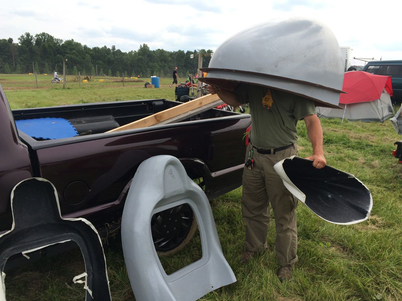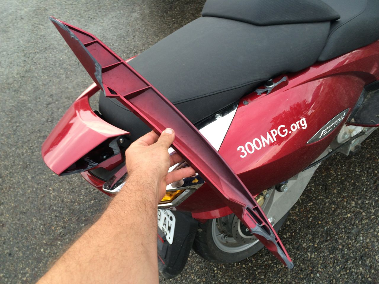 Oh no. Not the trailer of shame! The “Ha Ha, you couldn’t complete the course” trailer! Oh well, I was going to need a ride back to the race track anyways (where my truck was.) Once the truck got there, we loaded up the Vectrix, and I hopped into the tiny jump-seat in the back of the pickup truck. Moments after we were on the road, one of the tie-down straps gave way. We stopped and saw that the entire one side my my grab bar had snapped off! *sigh* I re-lashed down the cycle, this time popping the trunk and actually finding a steel frame member to hook to.