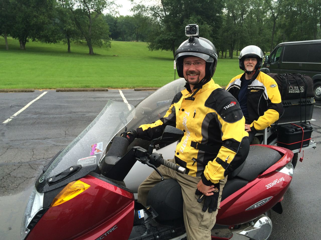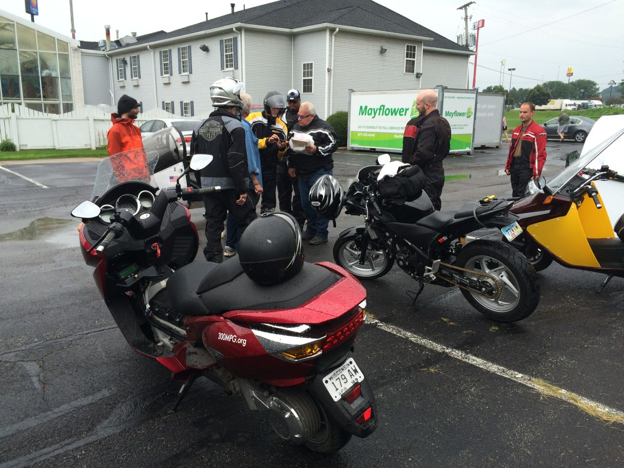 After a photo opportunity (and strapping a GoPro to my helmet) we all took off, with the electric group peeling off right away. The roads in the area were very nice. Good country roads, pleasant for zipping around on. The only exception was a single stretch of road, which was more potholes than pavement for half a mile! The weather wasn’t ideal, it was raining slightly when we left. Of course, I was the most amateur of anyone there. Many guys had full rain gear or leathers. At least I finally got myself a real motorcycle jacket! Fortunately, it never rained too hard, although the weather definitely affected our fuel economy. Later on, the weather cleared up, and it was pretty nice.